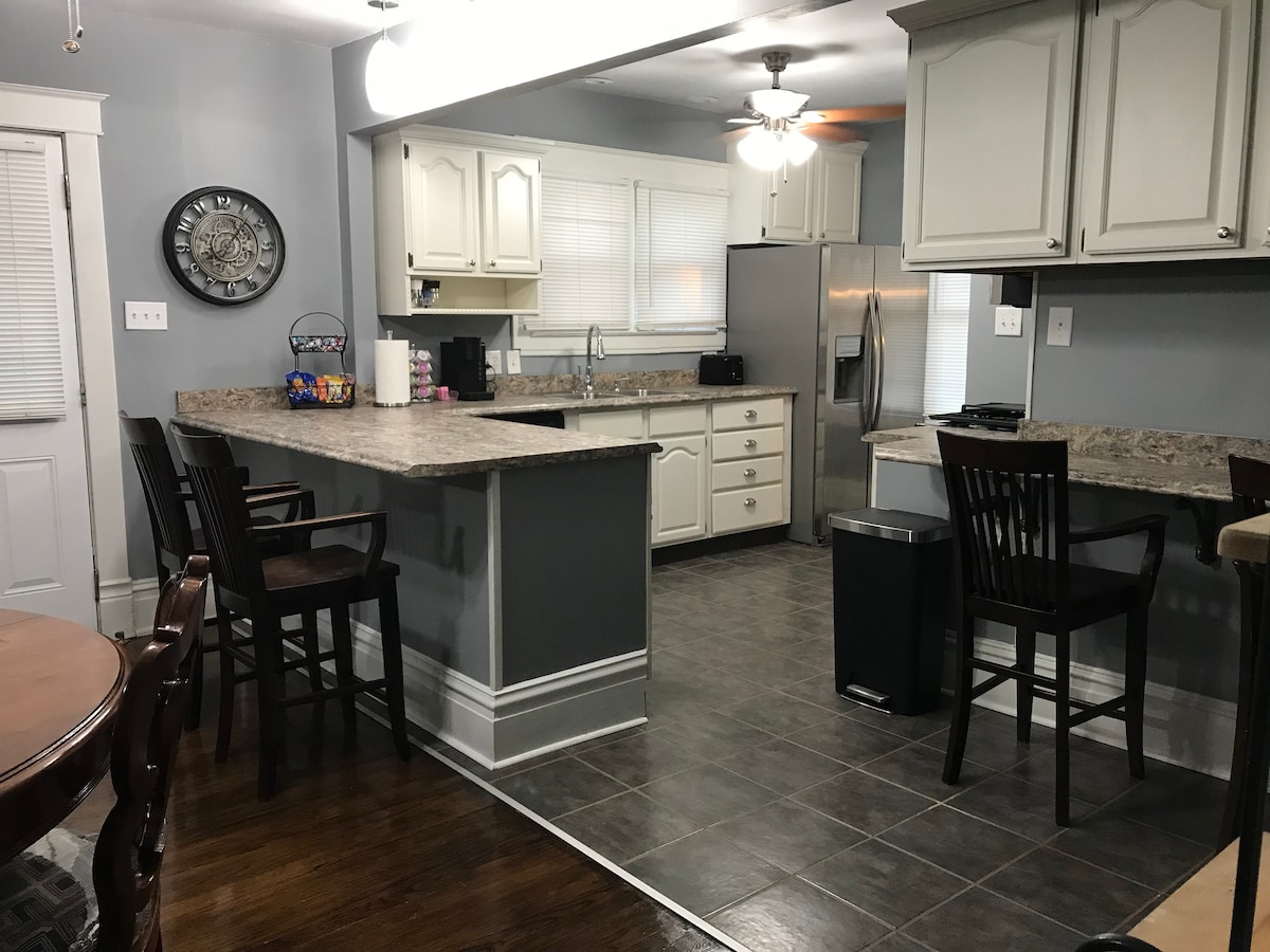 Spacious First-Floor Apartment Private 2-bedroom apartment with a king and queen bed, full kitchen, and spacious living room featuring a 65” smart TV , a new queen size sofa sleeper and a gas fireplace. Enjoy endless hot showers and relax on the wrap-around porch with a swing and ceiling fans. On the back porch there is a 4 burner gas grill for your bbq needs. Hosts lives on 2nd floor and is available to make your stay easy and comfortable.