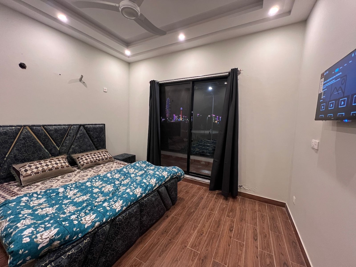 Enjoy a luxurious stay in the heart of Citi Housing Jhelum. This modern 1BR apartment features a king bed, stylish living room, LCD TV, sofa, and a beautiful balcony. The kitchen comes equipped with a fridge and microwave for a comfortable stay. Perfect for couples, solo guests, or business travelers looking for comfort, privacy, and a premium experience.