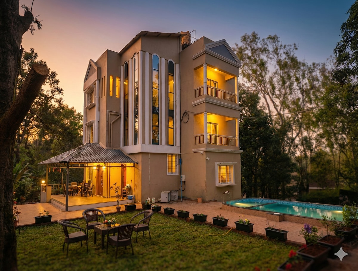 🌿 Fernstone by Wanderlust Retreats – Your Private Escape in Panchgani Step into our spacious 4BHK private villa, just 3 km from Panchgani Market, designed for families, big groups, & unforgettable memories. 🏡 What awaits you: * 4 large bedrooms (comfortable for 12–14 guests) * A big private swimming pool for endless fun * Beautiful green lawn with a cozy gazebo * In-house barbecue setup for relaxed evenings * Delicious home-style meals prepared by our in-house cook * Calm, scenic surroundings