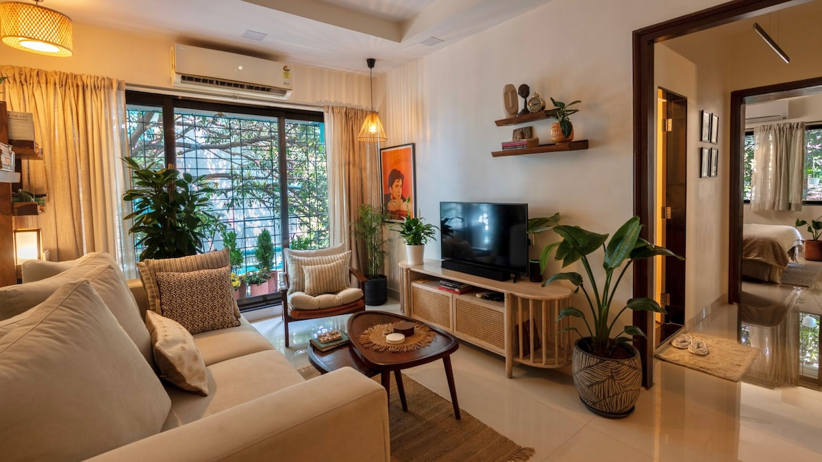 Wake up to rhapsody of chirping birds, gentle sea breeze & magnificent sunrise surrounded by lush greenery. Silver BEACH -5 min Walk Aksa BEACH-15 min drive Smart TVs , AC, Wi-Fi ,a Bath tub. Spend cozy afternoons in the balcony with a book and a cup of coffee ,amidst greenery . Stroll on the beach , Explore beautiful landscaped gardens , Pool & Quaint cafe of the luxury apartment complex , Set in peaceful & tropical neighbourhood of Madh Island Zomato Swiggy & Blinkit delivers