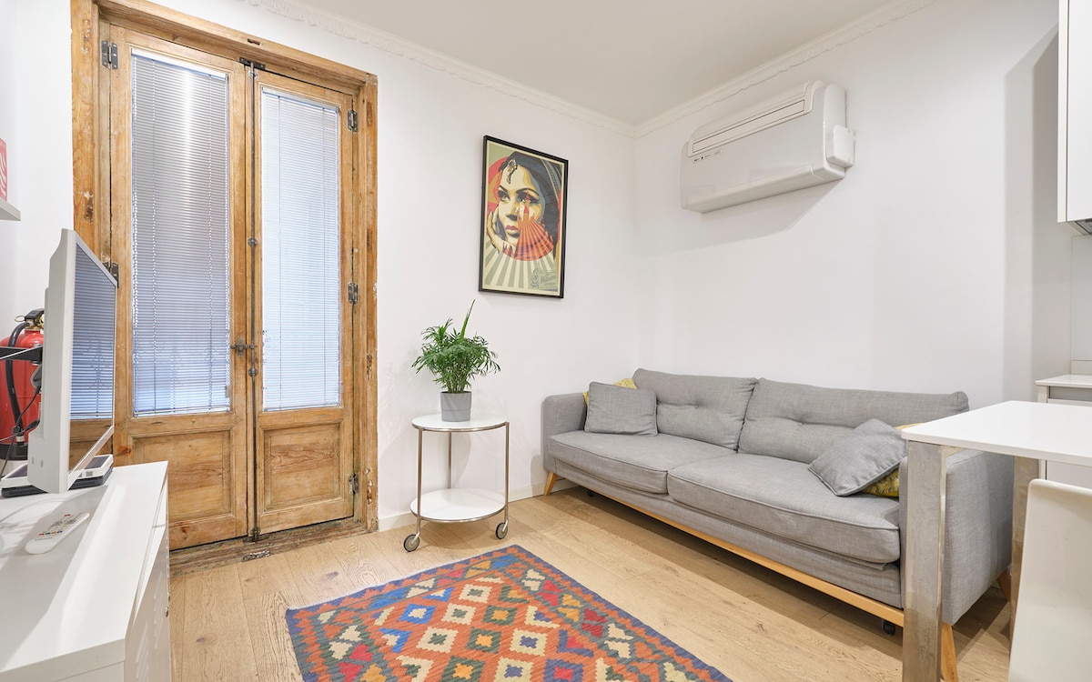 Newly renovated apartment in a historic building. You will feel at home since it is fully equipped. with its three balconies make this apartment a very spacious and comfortable place. It is located in a small street just off Gran Via. You will enjoy a wide variety of authentic cafes, tapas, bars and shops. It has a double bed in the bedroom and a sofa bed in the living room.