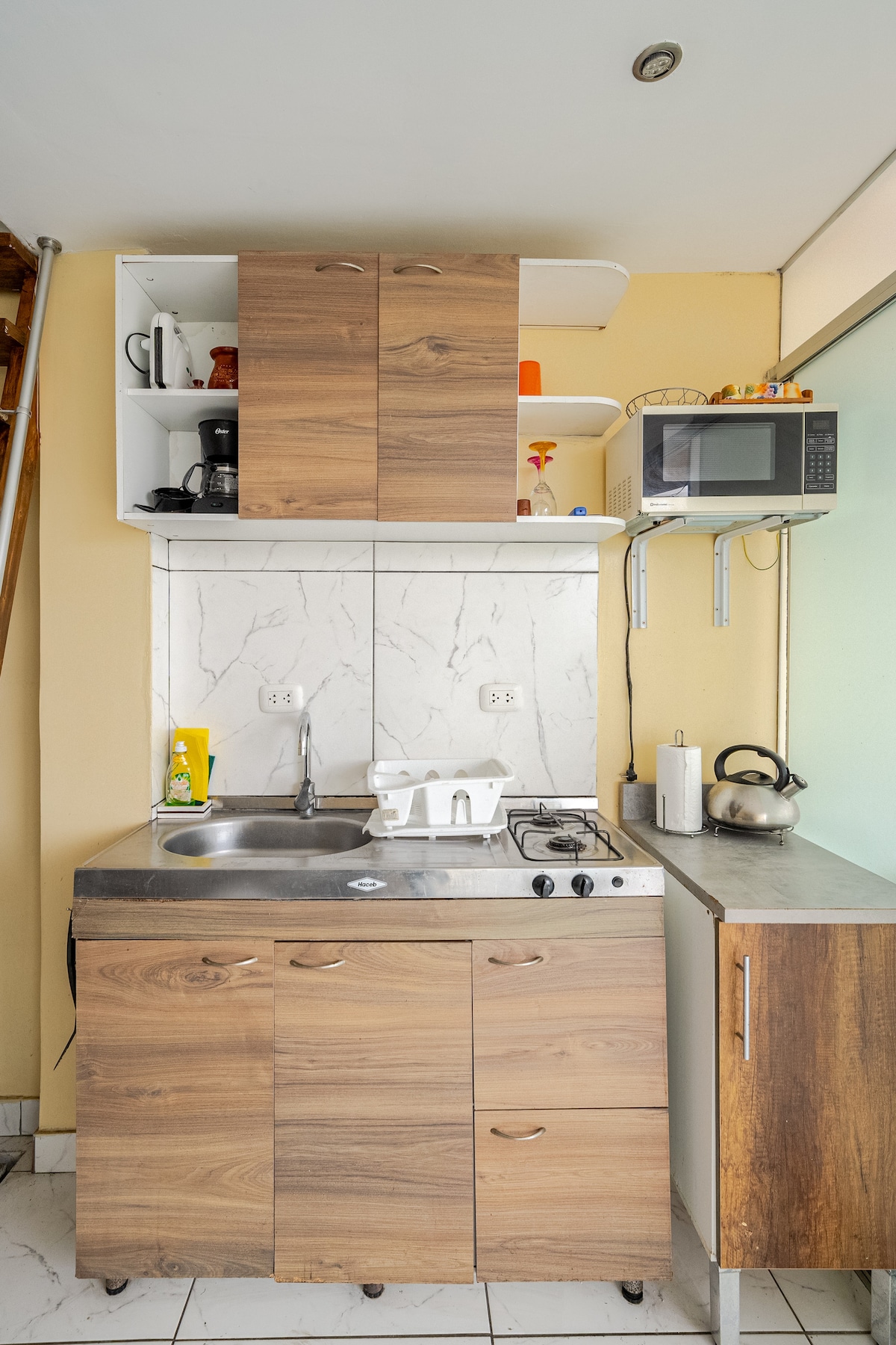 Hermoso Loft 5 piso sin ascensor cómodo y seguro, salita con sofa cama y TV Smart de 50" internet rapido y exclusivo. Pequeño y con todo lo necesario, el baño es de uso único de los huéspedes con ducha y agua caliente y esta fuera del ambiente principal (a 1 mt), el dormitorio tiene acceso por una escalera tipo gato con una claraboya que mide 0.60x0.60, 1 cama de 1 1/2 pza y 1 cama de 1 plaza, ducha española con agua fría, terraza de uso exclusivo. Cámara exterior en entrada del edificio