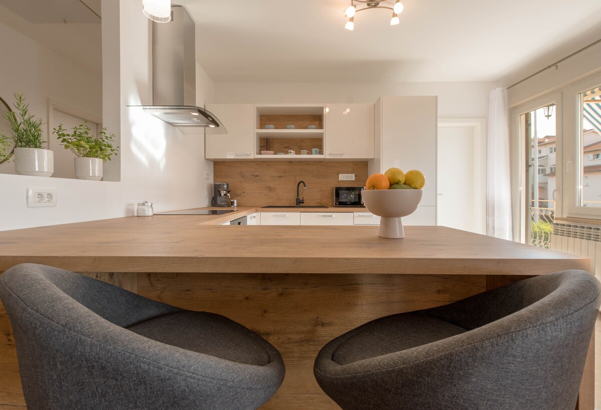 Verbringe deinen Urlaub in der neuen Vita-Wohnung. Stilvoll eingerichtete Wohnung mit drei Schlafzimmern in einem ruhigen Teil von Porec, nur 1500 Meter vom Strand entfernt und 2000 Meter von der Altstadt entfernt, werden dich mit modernen Details und Dekoration begeistern, die alle deine Bedürfnisse für einen wohlverdienten Urlaub erfüllen. Zwei Schlafzimmer, zwei Terrassen, ein offenes Wohnzimmer mit Essbereich und Küche sowie ein komfortables Badezimmer bieten ausreichend Platz für 6 Personen.