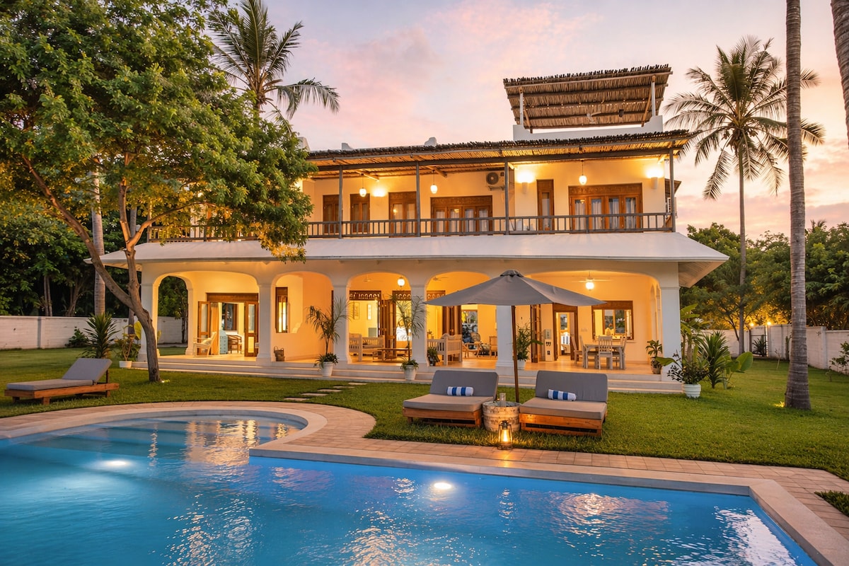 Traditional Swahili style house, stands on coral headland overlooking sea, beach, beautiful flowering gardens, private access to beach. Swimming pool recently installed, SEE HOUSE RULES Villa has 2 levels & views of Indian Ocean, private direct access to the beach, which stretches out either side, within the Marine Park. Includes 3 staff, cook, and daily room service, and gardener. Sleeps up to 10. Easily adapted and made comfortable to host smaller groups, by using just the upstairs bedrooms.