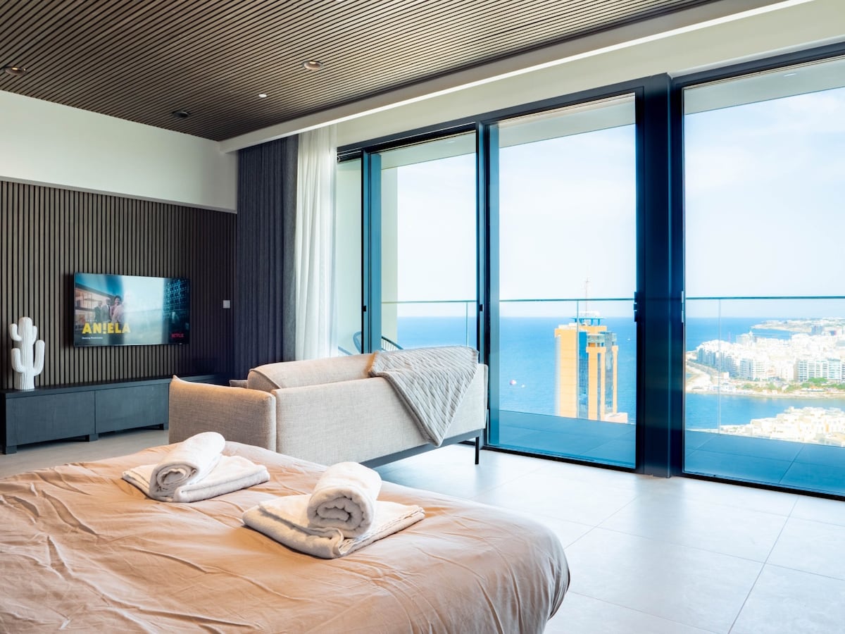 Willkommen in deinem luxuriösen, himmelhohen Rückzugsort in Maltas architektonischem Meisterwerk. Diese hochmoderne Wohnung befindet sich auf der 27. Etage und bietet einen unschlagbaren Panoramablick auf das Mittelmeer, von Portomaso Marina bis zur Spinola Bay und Balluta Bay, was eine unvergessliche Kulisse für Ihren Aufenthalt schafft.  Egal, ob du für Romantik, Geschäftsreisen oder einen Weihnachtsurlaub hier bist, dieses Haus vereint stilvolles Design, Komfort und eine erstklassige Lage im pulsierenden St. Julian's, einem der begehrtesten Viertel Maltas.