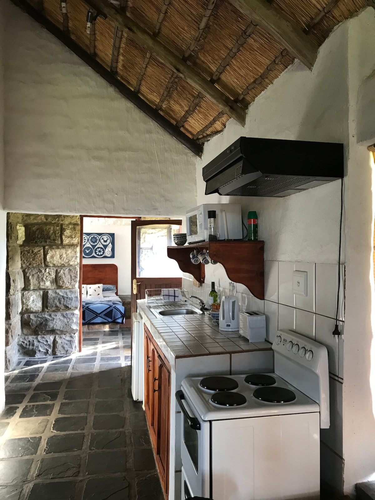 Auf halbem Weg zwischen Johannesburg und Durban. Ursprüngliches Berghaus aus Stein mit Strohdach mit Blick auf den Drankensberg. Herrliche Aussicht und ein Champagnerklima. Das Haus befindet sich in einem Naturschutzgebiet, das die einzigartige Fauna und Flora des afrikanischen Montane-Biosoms schützt.