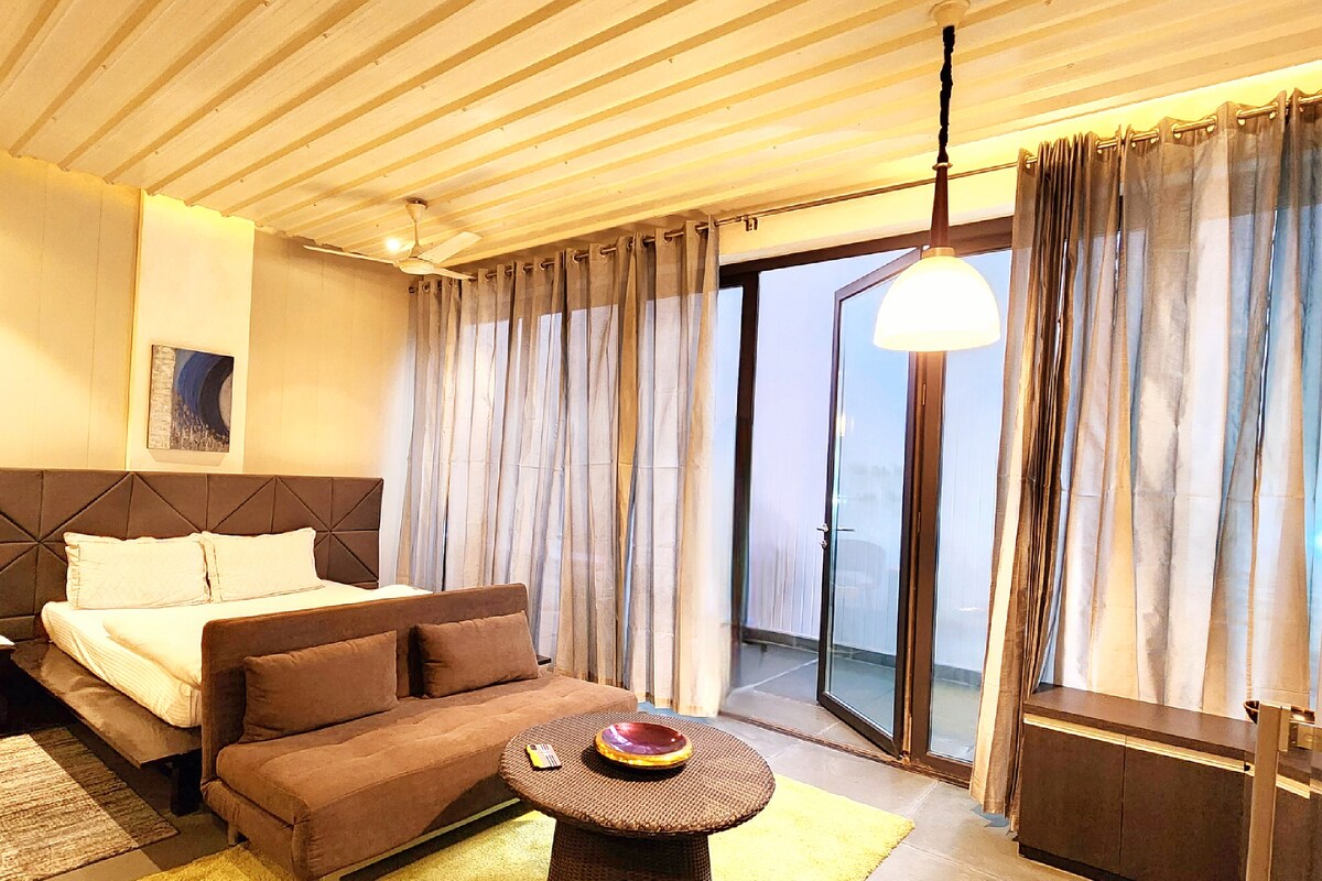Gemütliches Studio Loft in Sushant Lok mit Balkon mit Blick auf den Sonnenuntergang
