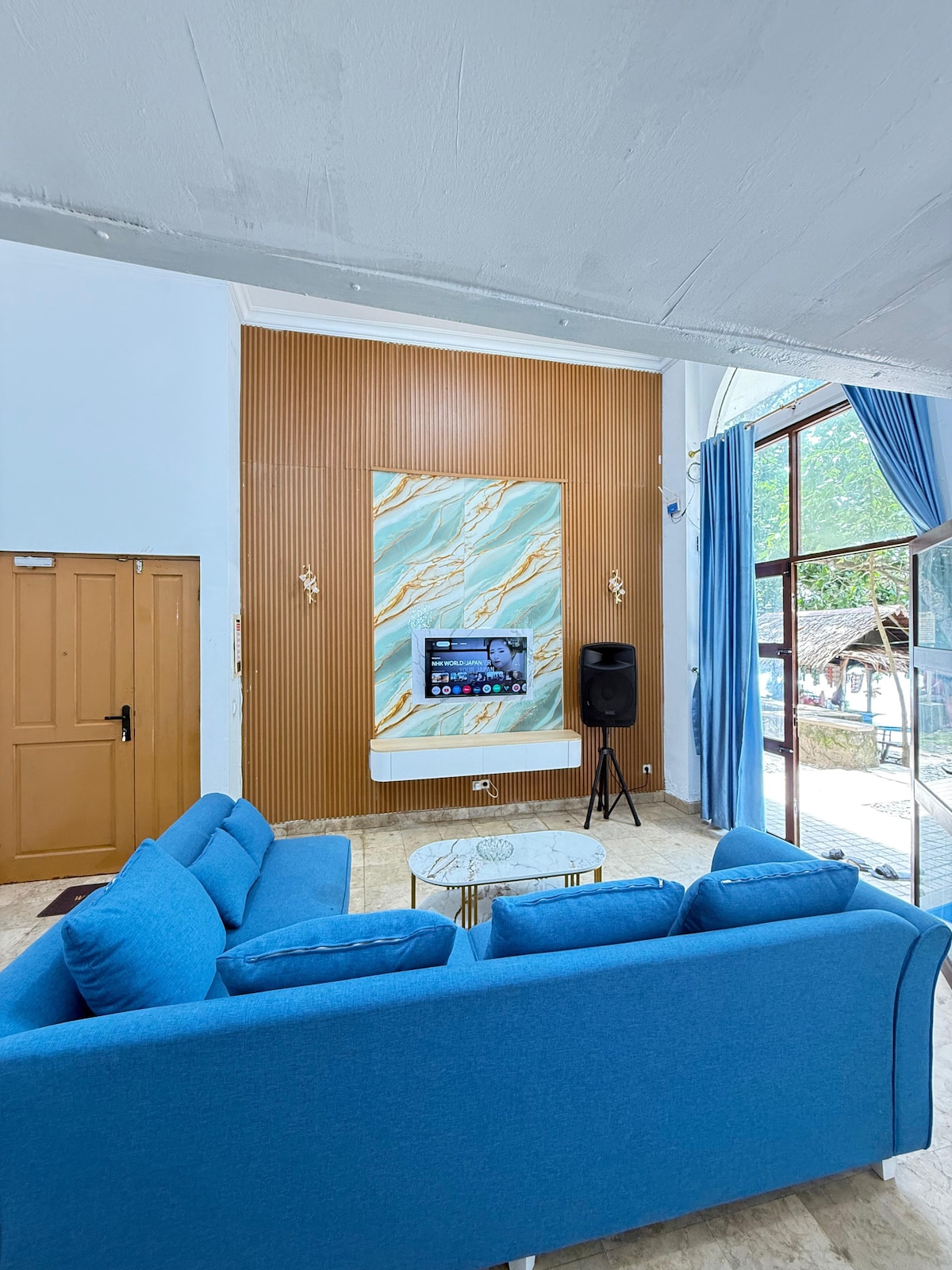 Beach Staycation in anyer beach Marbela with spacious room and complete tools. Max people : up to 8 adults Dining tools Cooking tools ( stove, microwave ) Water heater Tv swimming pool view.