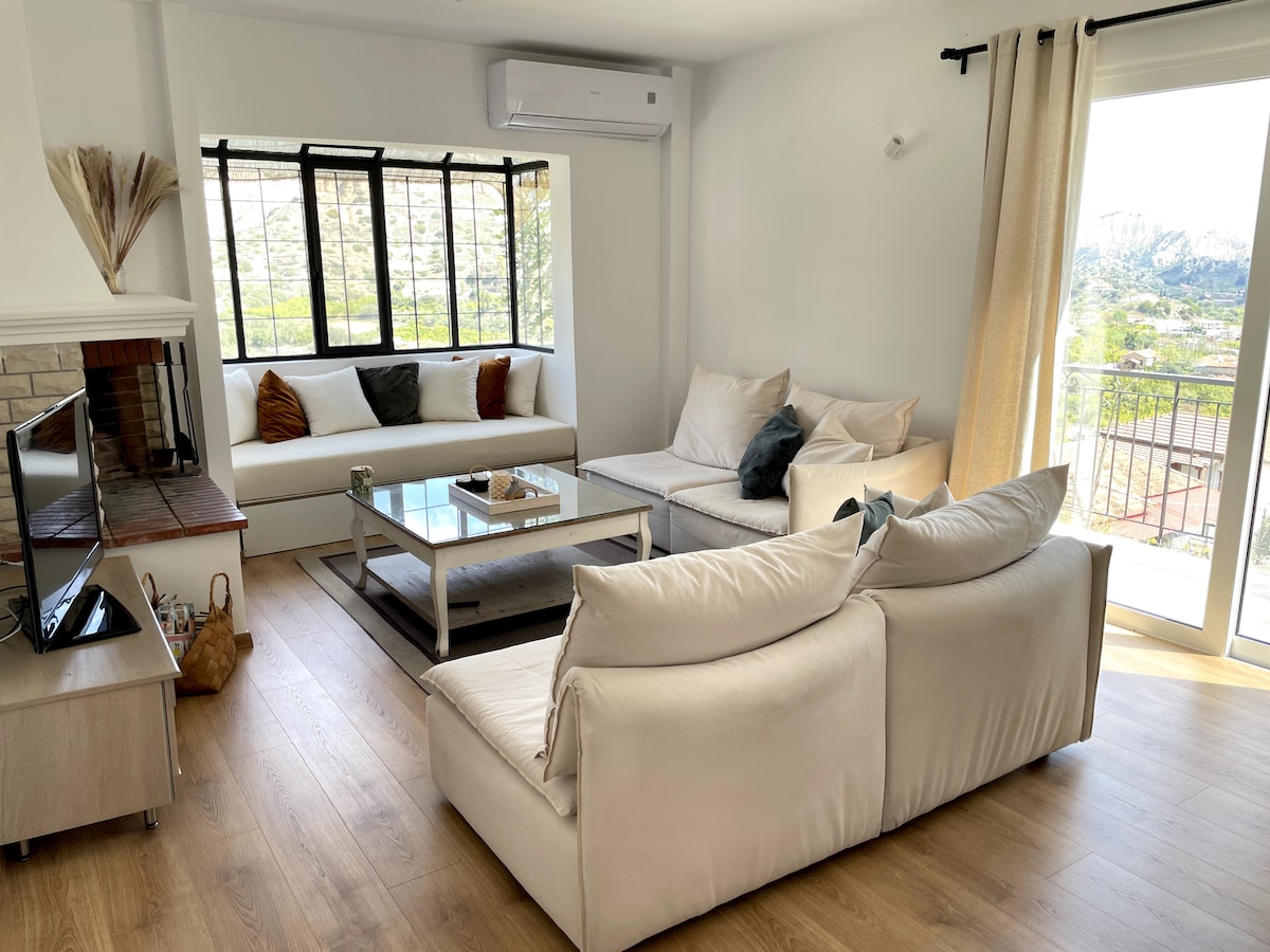 Entspanne dich in dieser ruhigen und eleganten Unterkunft mit einem atemberaubenden Blick auf den Golf von Korinth. Auf einer Höhe von 1150 Metern liegt es 5 Gehminuten vom Zentrum von Ano Trikala entfernt, das Ruhe und einfachen Zugang zu Tavernen und Cafés bietet. Das Haus ist komplett ausgestattet mit drei Schlafzimmern, einem offenen Wohnzimmer/Esszimmer/Küche, einem Dachboden und einem Badezimmer mit einem Jacuzzi mit Blick auf den Korinthischen Golf. Es gibt einen Holzofen aus Gusseisen und Heizkörper, die das Haus im Winter sehr warm machen.