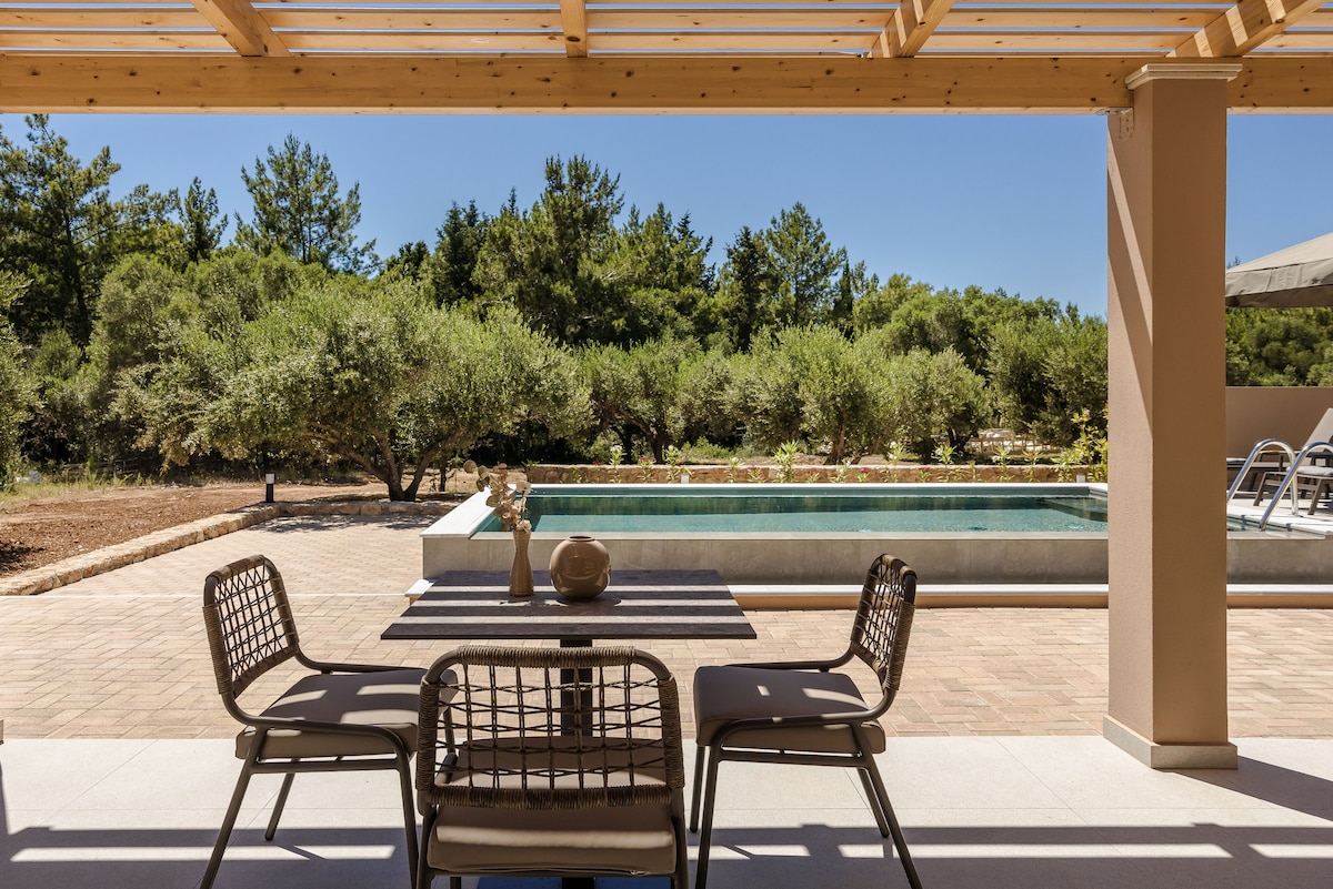 The boutique villa Sensi close to Lepeda beach, (20 meters walk), outside Lixouri (2 km away) is opening in July 2023. It is absolutely new and modern, comfortable, luxurious, not missing anything, promising journeys in the world of sensations. (as sensi means sensations in Italian). Sensi is a gorgeous villa of 180 sqm in two levels communicated with indoors and outdoors stairs. It is set in an olive grove (hence its logo) in a estate of 23.000 sqm with direct access to the beach!