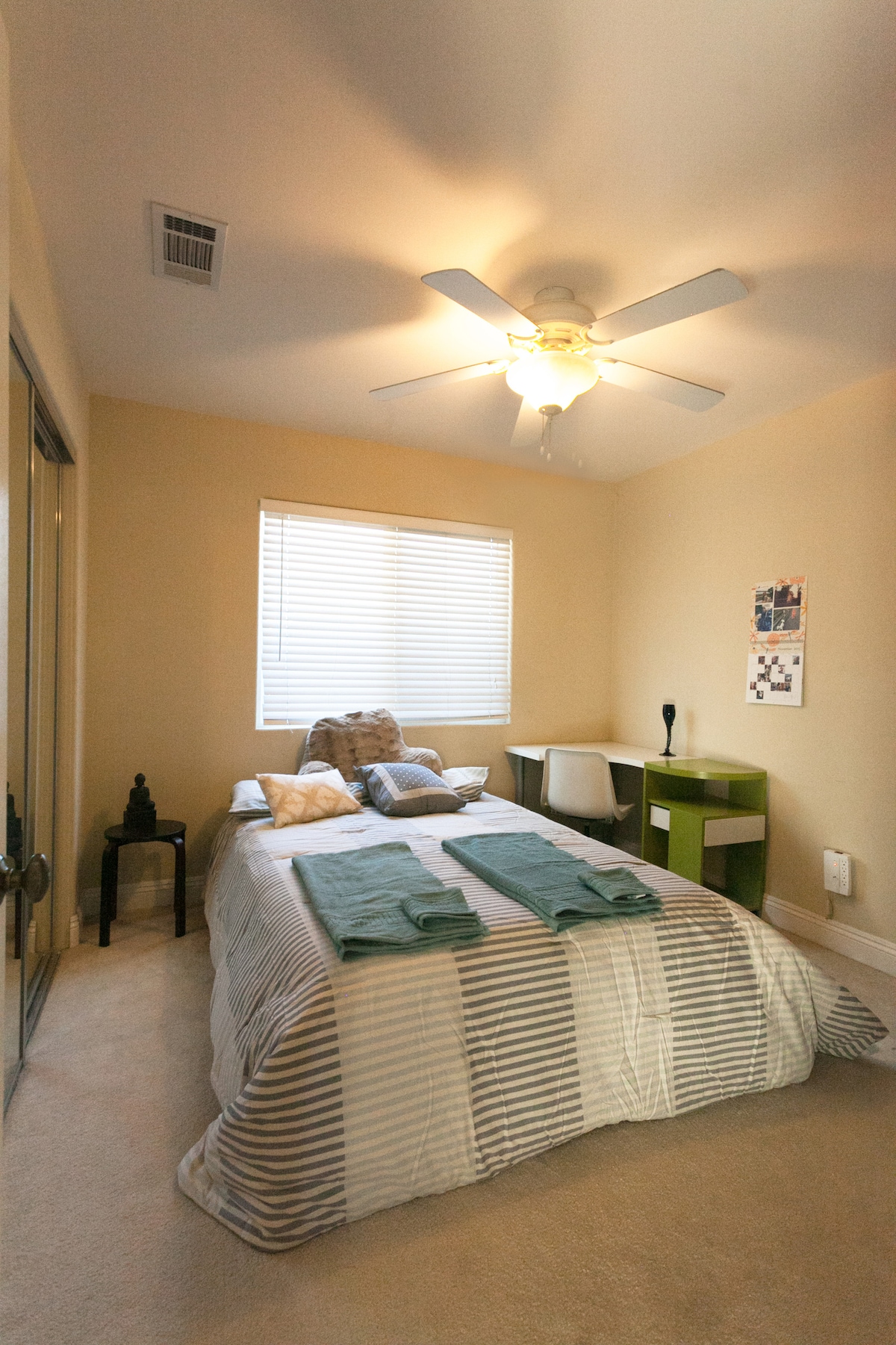 Stell dir das wie ein Hotelzimmer oder ein minimalistisches Studio vor. Die gesamte Einheit ist: - EIN kompaktes Zimmer - Badezimmer - Privater Eingang Es gibt keine Küche oder Wohnzimmer. Es ist an mein Haus angeschlossen. Das Zimmer verfügt über eine Samtcouch, die in ein Doppelbett umgewandelt werden kann. Das Bett ist mit seiner 2-Zoll-Matratzenauflage äußerst bequem. Es wird bei der Ankunft als Bett bereitstehen und lässt sich leicht in eine Couch umwandeln. Es gibt einen Schreibtisch, einen Kühlschrank mit Gefrierfach, eine Kaffeemaschine, Kaffee, Tassen, Utensilien, Teller, Schüsseln, eine Waschmaschine mit Trockner und Waschmittel.