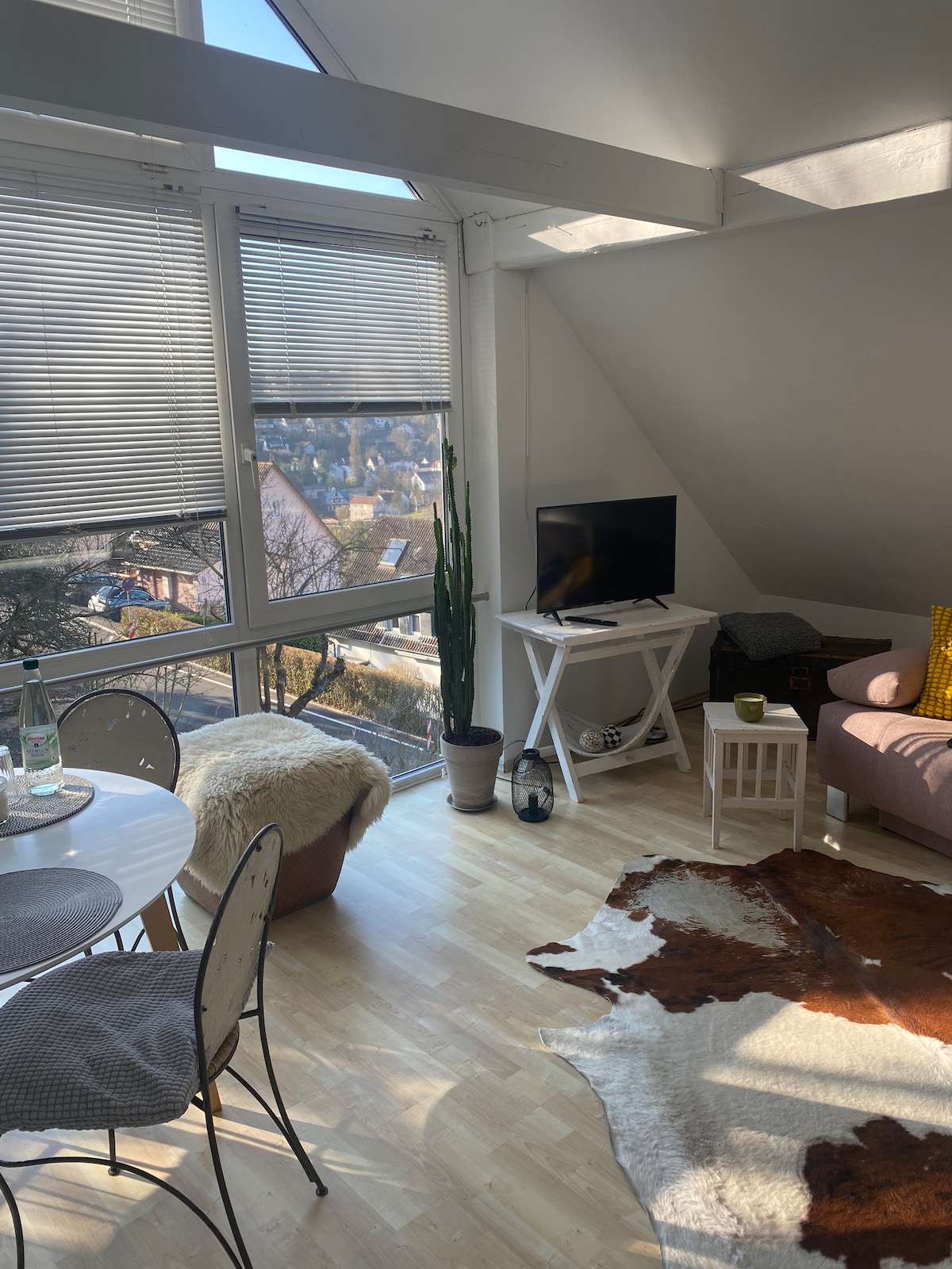 Wir vermieten eine moderne, helle, 60 m2 große Ferienwohnung in idyllischer Stadtrandlage. Die Küche ist komplett ausgestattet und für den morgendlichen Kaffee lädt der Garten mit Sitzgelegenheiten, welcher direkt an den Wald grenzt ein. Auch von der großen Dusche aus, kann man manchmal ein Reh im Wald beobachten. Das Schlafzimmer ist durch eine Schiebetür von dem Wohn- und Esszimmer getrennt. Durch die große Fensterfront hat man einen schönen Ausblick Richtung Innenstadt.