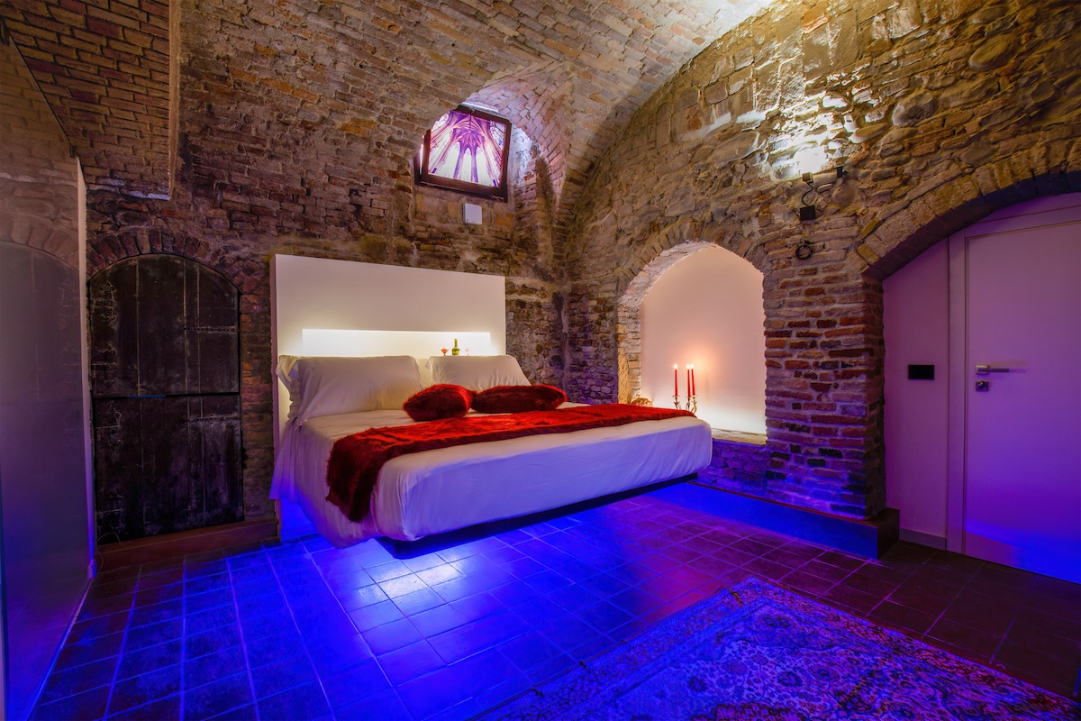 Die Suite Selene mit transparentem Whirlpool für 2 Personen und einem großen szenografischen Bett auf der Galerie unter den Kreuzgewölben ist das Paradies für Paare, die Romantik ohne Grenzen lieben. Die Suite befindet sich im Erdgeschoss des Palazzo Morandi-Bonacossi mit Fenstern zum zentralen Platz der Burg und zum Uhrturm. Der Göttin des Mondes gewidmet, die in einen sterblichen jungen Mann verliebt ist, hat die Zeit mit einem ewigen Schlaf gestoppt, aus dem er ihn jede Nacht mit seinen Küssen erweckt.