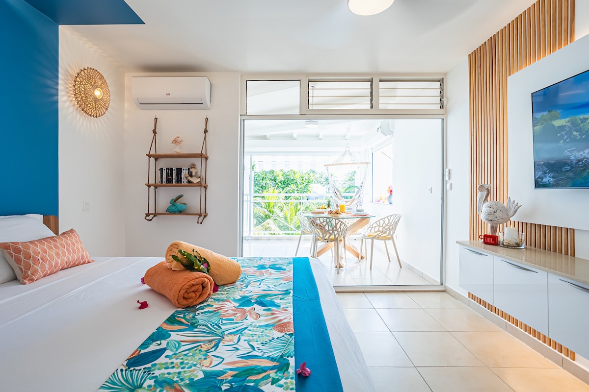 Entspannen Sie sich in dieser einzigartigen und ruhigen Unterkunft. Das große Studio neben der Villa befindet sich in Petit Havre Le Gosier und bietet Ihnen auf ca. 45 m2 allen erdenklichen Komfort mit einem großen Doppelbett und einem Schlafsofa, einer schönen Terrasse mit Esstisch und Blick auf den tropischen Garten. Meerblick vorne und 4 Strände sind 3 Minuten zu Fuß entfernt!! Stellen Sie Ihre Koffer ab und genießen Sie Guadeloupe!