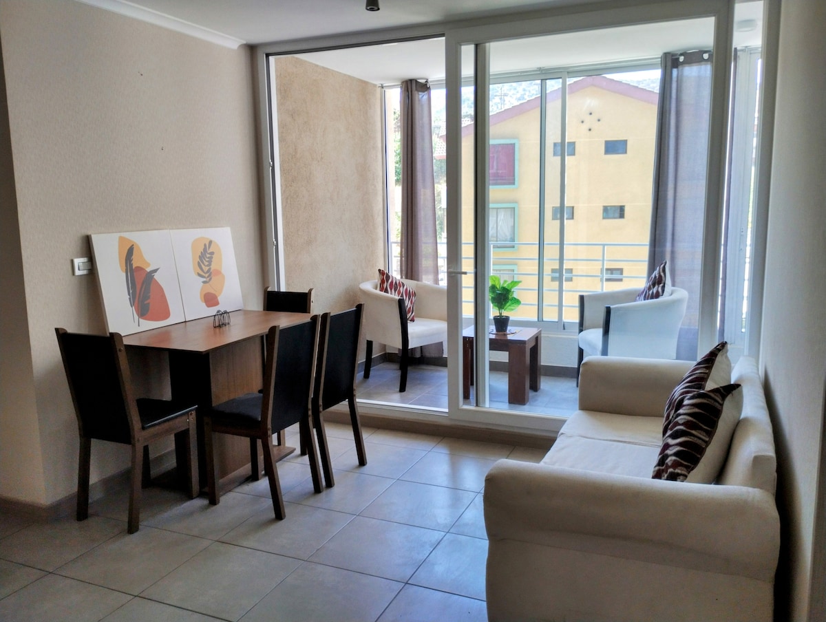 Departamento acogedor, precioso y elegante en el condominio resedencial tranquilo. Lugar perfecto para una escapada romántica o viaje en familia con niños pequeños (una cama 2 plazas y una sofa-cama). Pet-friendly: amamos a sus bebes peluditos. Patio jardin privado para disfrutar aire fresco, colibris y vecinos gatunos a veces). A pasos de estacion del metro, conectividad perfecta con las playas y valles de la región. Conserjeria 24/7, supermercados Tottus / Santa Isabel, almacenes, delivery.