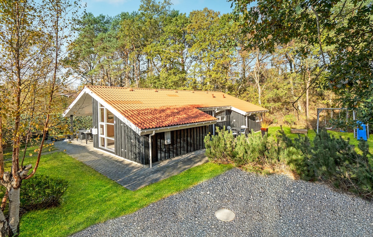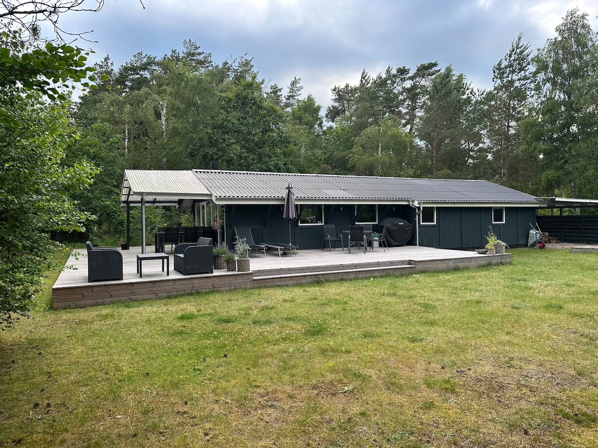 Ein schönes, neueres, familienfreundliches, ganzjähriges Ferienhaus im Wald - 109 m2 + 45 m2 Anbau, Außen-Whirlpool, Whirlpool und Sauna. Es gibt Terrassen rund um das Haus, einen Beachvolleyballplatz und einen Lagerfeuerplatz. Es ist nur eine kurze Strecke bis zum Meer und 10 Minuten zu schönen Stränden in Øster Hurup und 5 Minuten zum Einkaufen. Das Haus bietet Platz für 8-10 Personen. Das Haus ist mit Glasfaser-Breitband und WLAN ausgestattet, das das gesamte 3000 m2 große Naturgrundstück abdeckt. Im Juli und August ist der Check-in am Samstag. Es kann in bestimmten Zeiträumen einige Insekten geben.