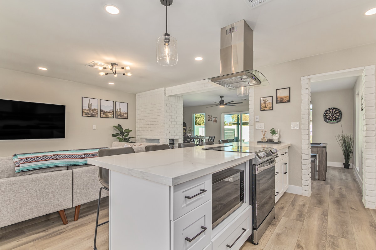 Discover your stylish oasis in South Scottsdale, moments from Old Town. This 4-bedroom w/ 7 beds retreat features all new furniture, TVs in every room, pool table, arcade game, and memory foam mattresses. The fully remodeled house offers a dazzling sunset mural as you walk out to the spacious backyard for games, BBQ, hammock, outdoor dining table, plenty of seating and a beautiful diving pool with electric heater (inquire for more info). Have the ultimate time at this relaxing retreat!