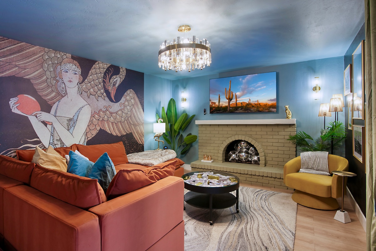 Discover your stylish oasis in South Scottsdale, moments from Old Town. This 4-bedroom w/ 7 beds retreat features all new furniture, TVs in every room, pool table, arcade game, and memory foam mattresses. The fully remodeled house offers a dazzling sunset mural as you walk out to the spacious backyard for games, BBQ, hammock, outdoor dining table, plenty of seating and a beautiful diving pool with electric heater (inquire for more info). Have the ultimate time at this relaxing retreat!