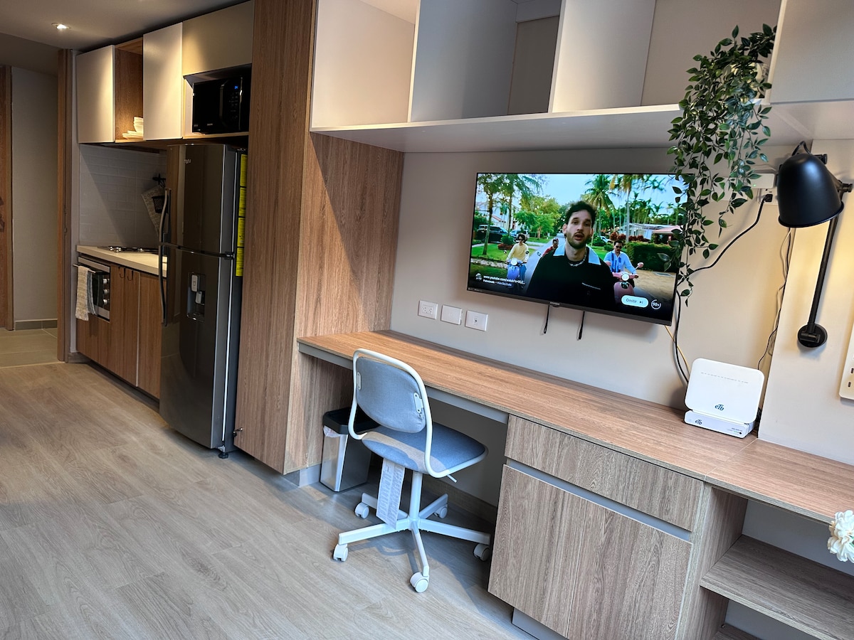 Relax in a modern and cozy loft — spotless and equipped with everything you need to feel at home. It features fast WiFi, a fully equipped kitchen, and a very comfortable bed, ideal for short or long stays. The building includes a shared rooftop terrace with an urban view, coworking spaces, and 24/7 reception. Located in Chapinero, a central and well-connected area of Bogotá. You’ll find great cafés, restaurants. Attentive and friendly communication throughout your stay.