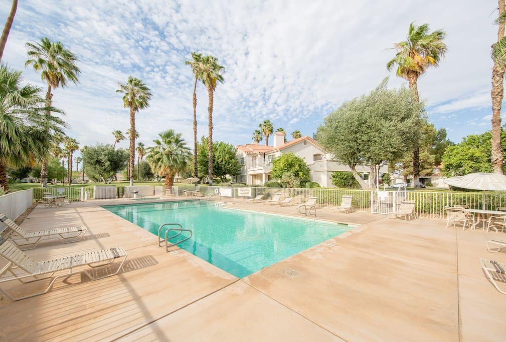 Our colorful, desert themed 2br/2ba lower unit condo is bright, spacious, & furnished with everything needed for a relaxing vacation. Great Wi-Fi for Zoom calls if needed! One of the many community pools/hot tubs sits steps away from the back patio, overlooking a beautiful greenbelt, palm tree lined sky, and peekaboo mountain range views with stunning sunsets. This is a no pets property. Pack n play & high chair in unit.