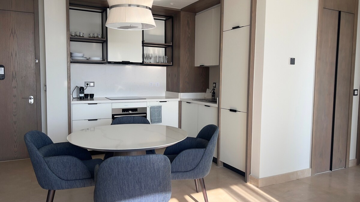 Luxurious apartment in the prestigious Four Seasons Alexandria. Features a master bedroom with king-size bed, ensuite bathroom, walk-in dressing room, and sea-view balcony. Second bedroom has two single beds and sea views. Spacious living room, dining area, fully equipped kitchen, laundry room, and a separate full bathroom. Enjoy luxury hotel services, private beach and pool access, shopping, and entertainment within the building. No electricity cutoffs for uninterrupted comfort.