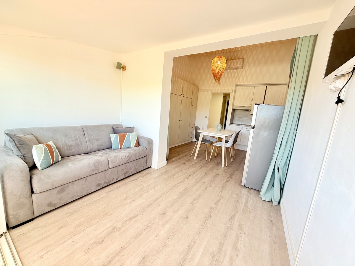 Gemütliches Studio, sehr hell, mit Blick auf das Meer, 17 m², klimatisiert, im Zentrum von Heliopolis H, im 4. und letzten Stock mit Terrasse von 5 m² mit Meerblick. Die ++ ✔ Klimaanlage. ✔ Meerblick. ✔ Keine Servicegebühren. ✔ Renoviert im Jahr 2022. ✔ Glasfaser-Internet und angeschlossenes Fernsehen. ✔ Bettwäsche, Handtücher, Strandtücher werden zur Verfügung gestellt. ✔ Notwendig für Ihr Frühstück bei Ihrer Ankunft: Kaffee, Tee, Schokolade. Sicherer ✔ Privatparkplatz auf dem P1-124
