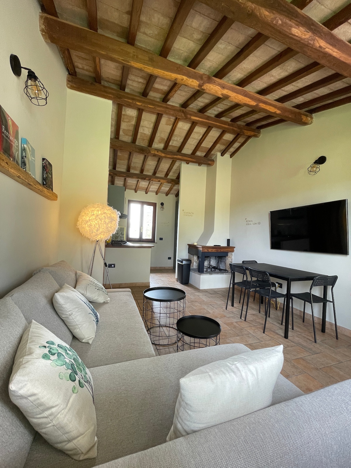 Erstaunliches Landhaus inmitten des Weinbergs der Cantina Lapone mit Blick auf Orvieto. Kürzlich restauriert, über 100 m², auf zwei Etagen verteilt. Das Erdgeschoss ist ein einziger Raum mit einem großen Wohnzimmer (mit Kamin) und einer geräumigen offenen Küche. Erster Stock mit zwei Schlafzimmern und zwei Badezimmern: das Hauptschlafzimmer (mit Blick auf Orvieto) mit einem Doppelbett und einem internen Badezimmer und ein zweites mit einem Doppelbett und einem Schlafsofa. Privatgarten und Parkplatz. Privater Pool (gemeinsam mit einem anderen Haus für 4 Gäste).
