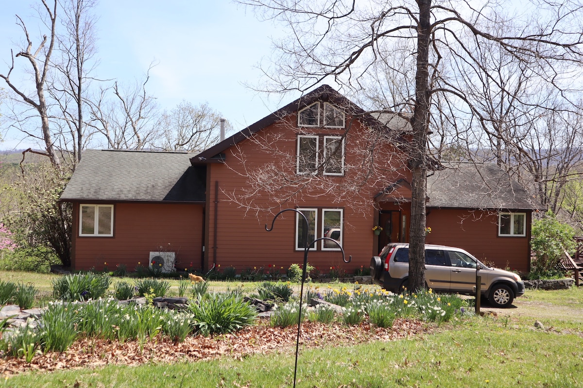 Berghaus: wie im Kino, auf 50 Hektar. Beinhaltet atemberaubende Bergblicke, Schwimmlöcher, Wanderwege, ATV-Strecken, Anglerbach, Mini-Strand mit weißem Sand, Whirlpool in einer Höhle, riesige rustikale Feuerstellen, Höhle, See, Cabanas, alles in einem dichten Wald exklusiv für Gäste. Privat: Du kannst kein anderes Haus von der Veranda oder den hinteren Decks aus sehen und es hat überall dicke Wälder. Oben auf dem Grundstück gibt es einen atemberaubenden Blick mit 3 Meilen Sichtbarkeit. Du musst nicht in den Nationalpark gehen.