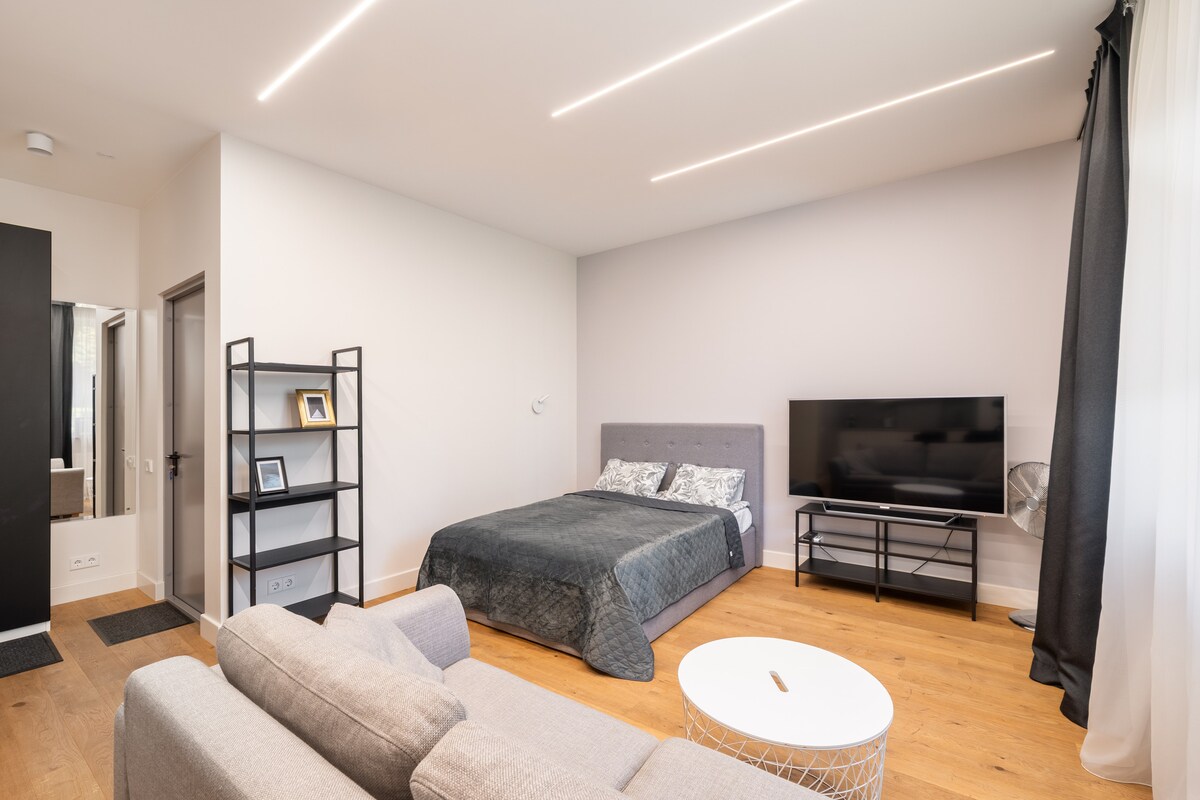 Nur wenige Schritte vom Sandstrand von Jurmala entfernt, verbindet dieses stilvolle 30 m² große Studio im Erdgeschoss am Dzintaru Prospekts den Charme des Meeres mit modernem Design. Es wurde sorgfältig renoviert und bietet einen hellen, offenen Grundriss mit einem bequemen Doppelbett, einem Schlafsofa, einer kompakten Küchenzeile und einem gemütlichen Sitzbereich. Große Fenster bringen natürliches Licht herein und blicken auf eine ruhige Straße. Perfekt für Paare und Familien, die Wohnung ist nur 100 m vom Meer und nur wenige Minuten von Waldwegen und Restaurants entfernt - Ihr ruhiger Rückzugsort an der Küste.