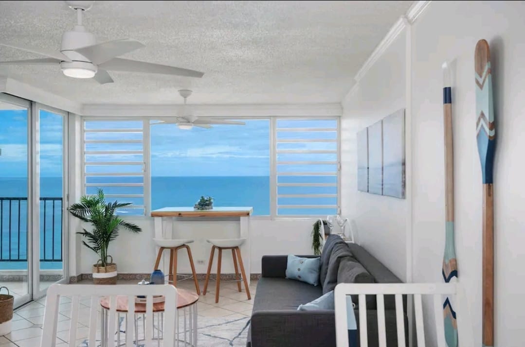 Our Amazing Beach Front Apartment it's located on the 8th flr so you have unobstructed view of the Ocean. Enjoy your coffee in the Morning, while feeling the Ocean breeze, then take stroll towards the beach (about 1/2 block). It's clean, modern and inviting for couples and families. It is also close to main attractions of the East of Puerto Rico, including Kioskos of Luquillo, the Rain Forest (El Yunque) and the Bio Bay. The Unit it's complete with Beach towers & Chairs and a complete Kitchen.