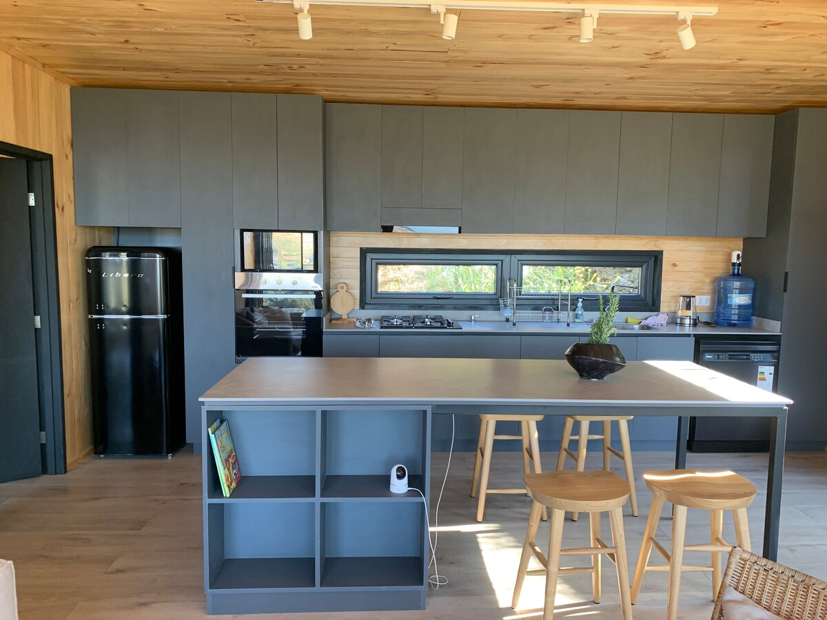 Acogedor refugio en doble altura(47mt2), de diseño único. Ideal para escapar del viento costero característico de la zona y disfrutar de templados valles, quebradas y naturaleza virgen. A pasos de la playa, restaurantes y supermercados. Servicio de HOT TUB $38.500 por estadías de 2 noches. Distancias: - A 2min de supermercado. - A 2,5km de La Vega de pupuya. - A 4km de Matanzas. - A 24km de Puertecillo. (40min) - A metros de Arena Pupuya Padel. En días de LLUVIA uso de 4x4 es requerido.
