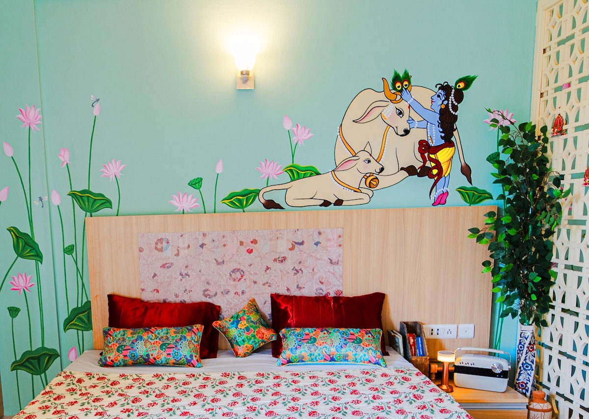 Peaceful, pretty & artsy! Less than 3 Kms (10min) from Prem Mandir, 3.5 Kms (12min) from ISKON and (15min) 4.5 Kms from Banke Bihari Step into a world of art and tranquility at our Pichwai-themed studio. This beautiful home features elegant fittings, stunning interiors, and a charming sit-out balcony perfect for relaxation. Enjoy easy access to prime temples, immersing yourself in the spiritual essence of Vrindavan. Abundance of modern amenities to ensure a comfortable and memorable stay.