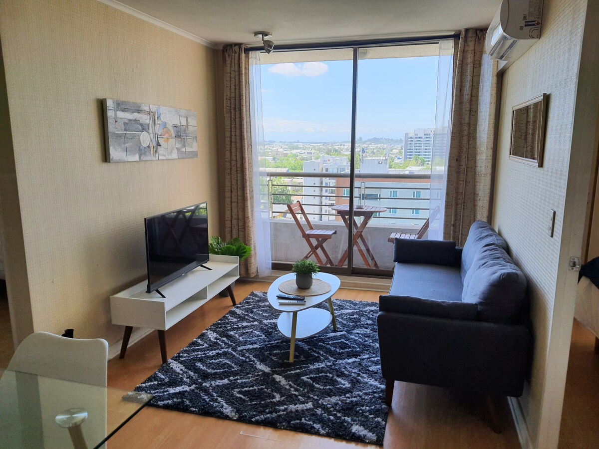 Entspannen Sie sich in diesem ruhigen und eleganten Raum mit Blick auf die Bergkette, einem Pool auf dem Dach, voll ausgestatteten Verdunkelungsvorhängen im Schlafzimmer und Wohnzimmer, Heizung und Klimaanlage, privatem Parkplatz im Gebäude, Concierge am Eingang des Gebäudes, Univ. Católica ist 8 Gehminuten und Inacap 8 Fahrminuten entfernt, nur wenige Schritte von der Plaza Mall und Jumbo und Lider Supermärkten, Apotheke, Minimarkt und Notar einen halben Block entfernt, Restaurants und Pizzerien in der Nähe.