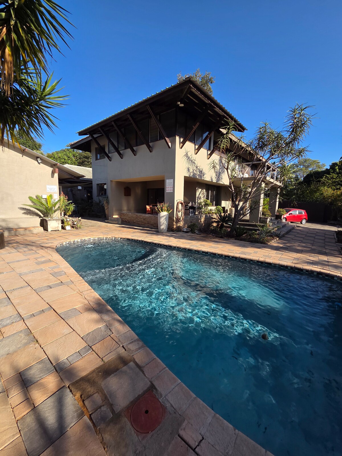 Die Selbstversorger-Einheit mit gesichertem Parkplatz befindet sich im Herzen von Nelspruit, in der Nähe vom Stadtzentrum, allen wichtigen Krankenhäusern, Annehmlichkeiten, dem Mbombela-Stadion, Einkaufszentren und verschiedenen Aktivitäten. Der internationale Flughafen Kruger liegt 25 km von der Unterkunft und ca. 50 km vom nächsten Tor des Krüger-Nationalparks (The Kruger Gate, Hazyview) entfernt. Mahlzeiten können gemäß deinen Ernährungsbedürfnissen gegen einen Aufpreis bereitgestellt werden. Die Gäste haben Zugang zum Pool sowie zum Braai-Bereich.