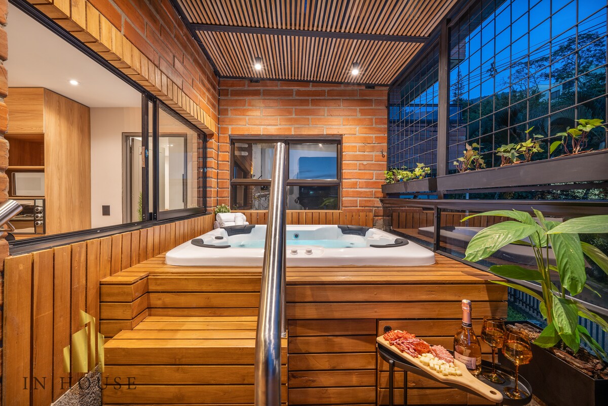Genieße Medellín von dieser eleganten Wohnung mit privater Terrasse und Whirlpool in der Vía Primavera, zwischen dem Parque Lleras y Provenza, der Gegend mit dem meisten Nachtleben und Stil der Stadt Das Design kombiniert natürliche Materialien, warme Beleuchtung und modernen Komfort und schafft eine perfekte Atmosphäre zum Entspannen oder Teilen eines Drinks am Abend. Verfügt rund um die Uhr über Klimaanlage, Warmwasser und Sicherheit Ideal für ein exklusives und authentisches Erlebnis im Herzen von Medellín.