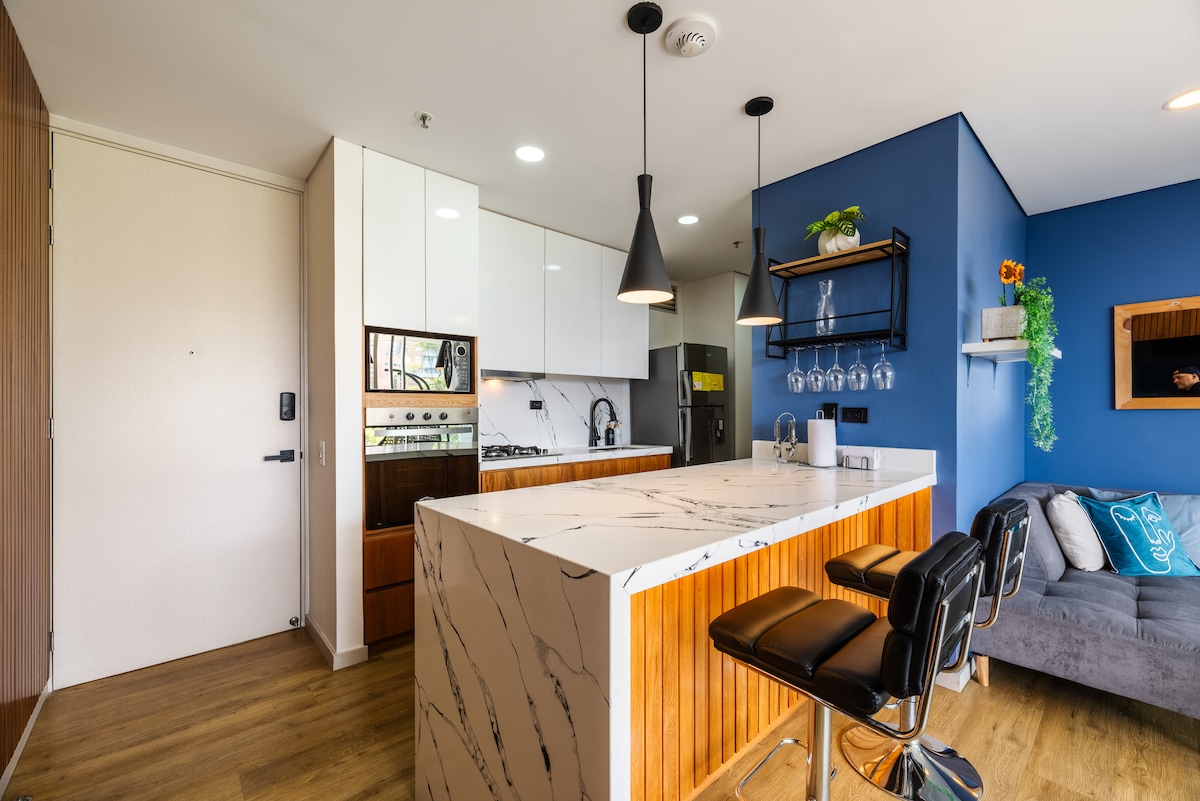 -High-speed internet great for remote work -Brand new A/C -Fully renovated design apartment - King size bed -Breathtaking views of Medellín (trust me, worthwhile to stay here) -16th floor -Unbeatable location in Poblado near to Provenza and Lleras Park -Modern amenities -Spacious living area -Smart TV x 2 -Washer & Dryer Tower -Pool and Gym -Coworking space -Restaurant inside the building -Parking lot -Self check-in -24/7 Security