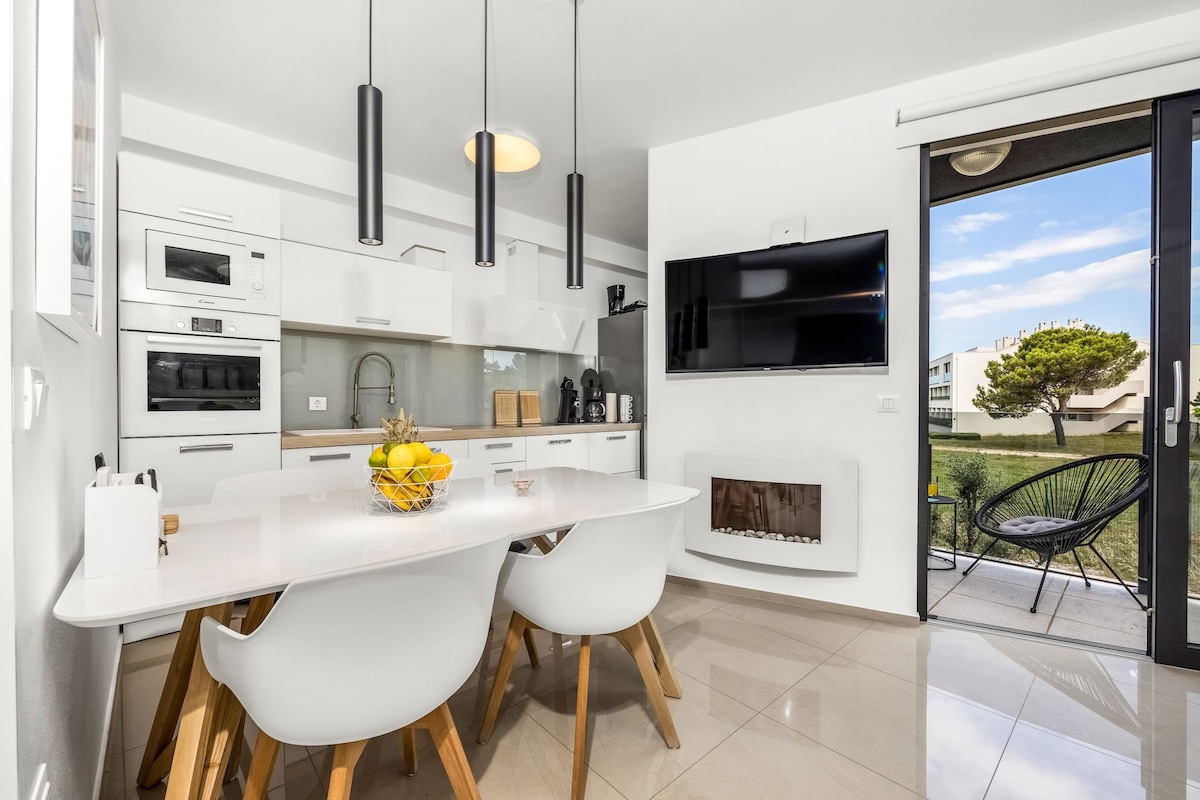 Luxuriöse und moderne Wohnung (65 m ²) mit großer Terrasse und 2 Schlafzimmern im Erdgeschoss. Die Wohnung befindet sich in idealer Lage in Medulin, in einer wirklich ruhigen und intimen Gegend, aber nur 5 Gehminuten vom Strand und den Restaurants entfernt. Bis zu 6 Gäste, privater kostenloser Parkplatz, schöne Terrasse - das macht deine Tage und Abende angenehm. Das Interieur ist gemütlich mit stilvollen und luxuriösen Möbeln, die dafür sorgen, dass du dich während deines Aufenthalts in der Wohnung wohlfühlst.