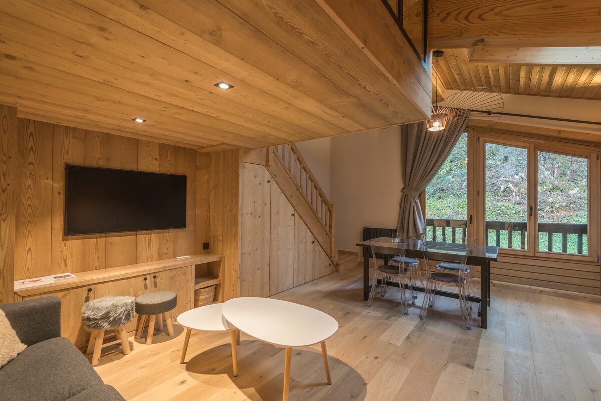 ✨Brand New 2025 built in Megève✨ 4BR, 3.5BA duplex at the Chalets of L’Éclat des Vériaz, nestled in a 3-hectare park with Mont Blanc views. Indulge in the spa with indoor/outdoor pools, sauna, hammam, jacuzzi, salt cave, gym & lounge. Families will love playgrounds, kids’ playroom, tapas lounge & massage room. 1.3 km (15'stroll/7'free bus/3'car) from Megève’s ski slopes, boutiques, cafés & gourmet restaurants!