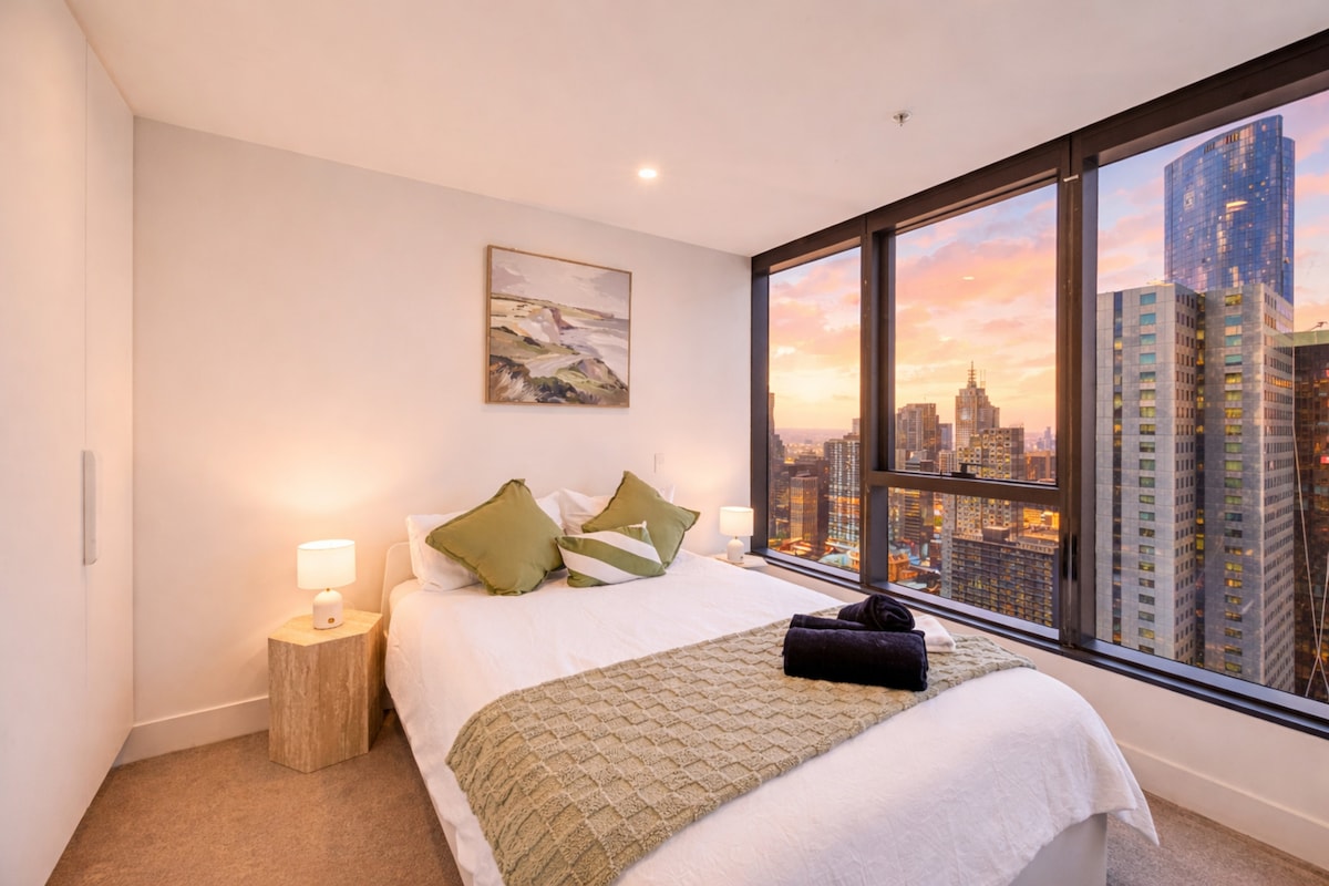 Bleib nicht einfach nur – nimm dir Zeit, um dich zu entspannen, zu reflektieren und deinen Alltag zu verbessern. Das Amor Condo liegt 38 Stockwerke über dem höchsten Wohnturm Australiens, dem Australia 108 in Melbourne, und ist ein luxuriöser Rückzugsort mit atemberaubendem Blick auf die Bucht und die Stadt. Wache bei Sonnenaufgang auf, entspanne dich bei Sonnenuntergang – alles von deinem privaten Balkon aus. Perfekt für romantische Ausflüge oder konzentrierte Geschäftsreisen. Was unsere Gäste lieben: • Blick auf den Sonnenaufgang und Sonnenuntergang vom Balkon • Gehen Sie zu Crown, NGV & Essen • Zugang zum Pool und Fitnessraum (AGB) • Privater Arbeitsbereich mit Blick auf die Skyline
