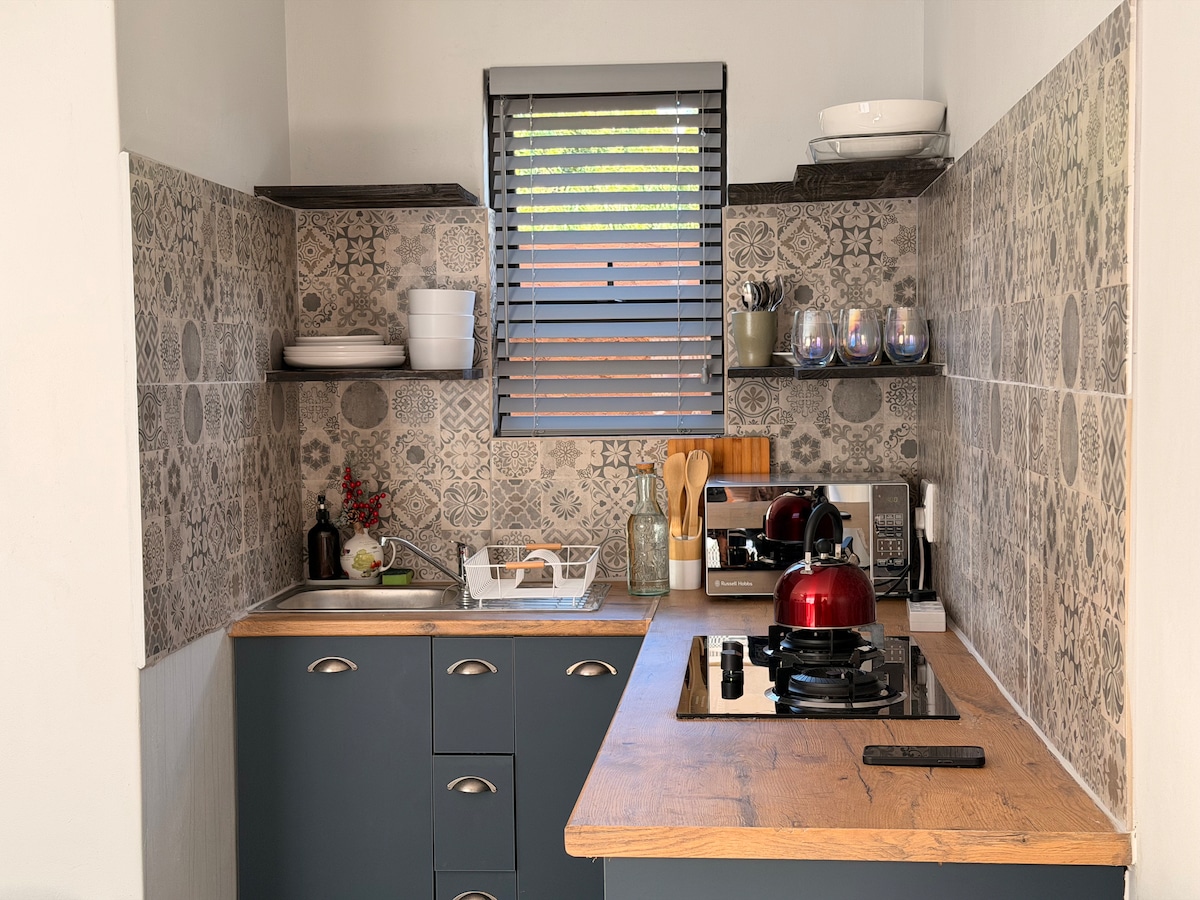 Unser Ferienhaus, mit Reserve-Solar- und Wassertanks, um sicherzustellen, dass unsere Gäste sich wohlfühlen, ist unter einem großen süßen Gummibaum versteckt. Bewacht von unseren beiden freundlichen Chow-Chow-Hunden blickt das Ferienhaus auf unseren Pool und verfügt über eine eigene Außenterrasse und einen Braai-Bereich. Im Inneren des Ferienhauses befindet sich eine gemütliche Studiowohnung mit einer Küchenzeile, einer Arbeitsecke mit WLAN, einem Schrank und einem bequemen Doppelbett. Das separate moderne Badezimmer ist mit frischen Handtüchern und Seife ausgestattet.
