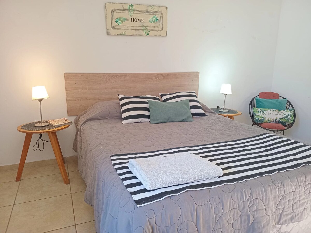 Bellisimo lugar, ubicado entre la zona comercial y de ocio de la ciudad. A solo unos minutos caminando de todo, incluidos supermecados,comercios varios y hospital. Cuenta con todas las comodidades de confort y relax, rodeado de arboles frutales; huerta organica; dos bellas pergolas; churrasquera; espacio para niños con columpio, areneo y casita de juegos. Un verdadero oasis en el centro de la ciudad.Te recibimos con un detalle de nuestra propia huerta organica y asistencia en lo que necesiten.