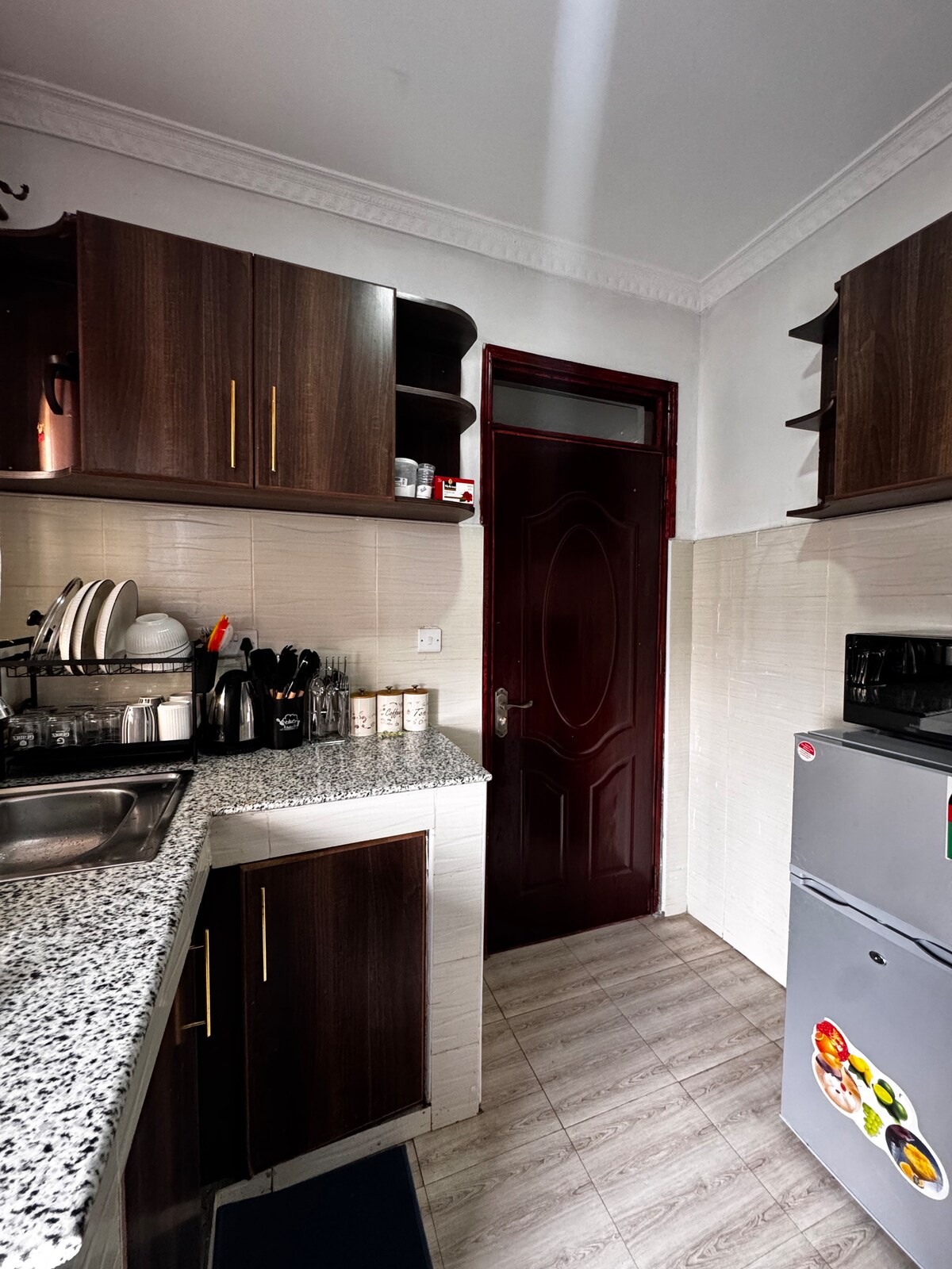 A lovely space to unwind and relax after a busy day whether it is work or play. Wake up refreshed and ready for the day with our selection of complimentary coffee and herbal teas. Head out and wander through the neighborhood that boasts of a prehistoric site, museum and a hill with views of Lake Nakuru National Park. The fully equipped kitchen is at your disposal. Whether you are looking to order in or fixing up an elaborate meal with your preferred wine-downer, we've got what you need.