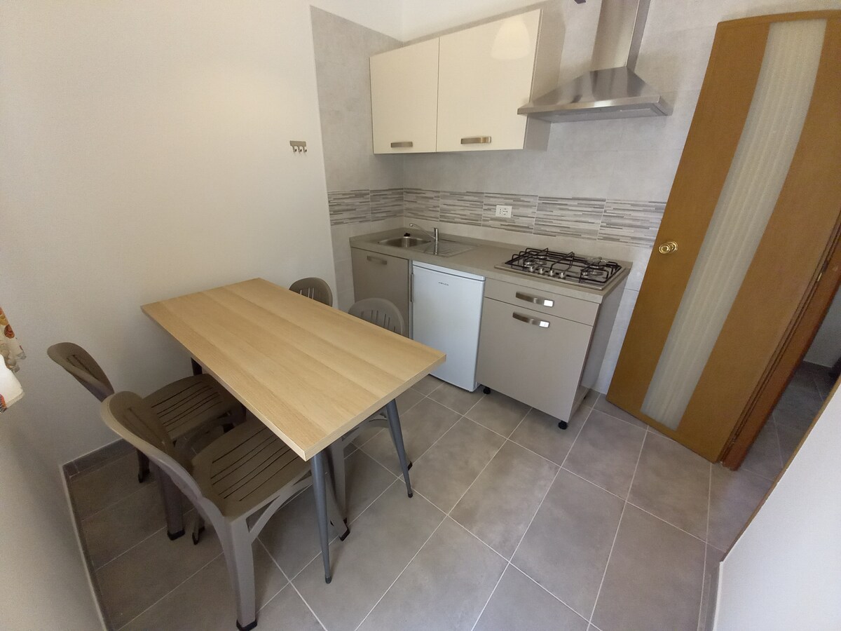 Schlafzimmer mit Doppelbett und Kleiderschrank, Schlafzimmer mit Etagenbett, komplettes Bettwäsche-Set) bad(WC,Waschbecken,Dusche,Fön, 2 kleine Handtücher, 1 Rolle Toilettenpapier, 1 Handseife) voll ausgestattete Küche (Kühlschrank,Spüle, Gasherd,Tisch 4 Stühle,Außentisch, komplettes Geschirr/Besteck)Ventilator,KLIMAANLAGE,Verbrauch inbegriffen, ZUSCHLAG FÜR Haustiere € 25,00 Kurtaxe € 1,00 pro Tag pro Person befreit unter 12 Jahren. Strand auf 300 m, supermarkt und Restaurants auf 200 mt.