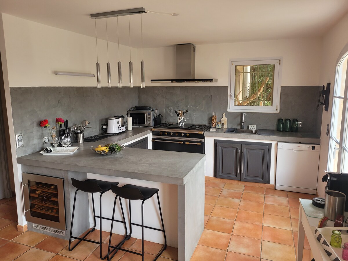 La bastide du Levant de 140 m² offre 3 chambres doubles avec 2 salles de bain, au rez-de-chaussée un bel espace à vivre avec grand séjour, salle à manger, cuisine entièrement équipée & coin cheminée ouvrant sur une spacieuse terrasse. Climatisation, chauffage & wifi. jardin clos de 800 m2 arborés de chênes, de fleurs colorées & d’herbes aromatiques. Le jardin est aménagé d’une piscine de 8x4m chauffée, d’une salle de bain, un pool house équipé d’un barbecue Green Egg et larges terrasses