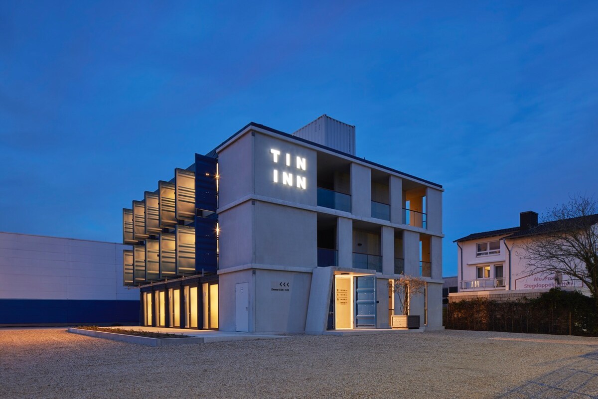 Welcome to TIN INN Erkelenz – our sustainable hotel concept built from recycled shipping containers. Enjoy high-quality, comfortable rooms with a minimalist design, no unnecessary frills. Your stay is 100% digital: check in and out via smartphone, unlock your room with one click, and experience modern, contactless hospitality designed for maximum convenience & flexibility. Plus: Your Co2 Footprint per night will only be 3,8kg CO2e if you stay at the TIN INN Erkelenz.