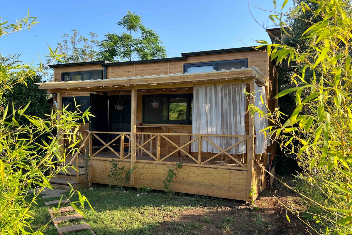 Enjoy a dreamy stay in our cozy tiny house just 3 minutes from the beach! Start your day with a delicious breakfast under big trees in our garden restaurant with charming wooden pavilions. Spend the day on sunbeds and under umbrellas by the sea. In the evening, relax with a freshly cooked dinner served daily in our garden area. The perfect blend of comfort, nature, and beachside peace.