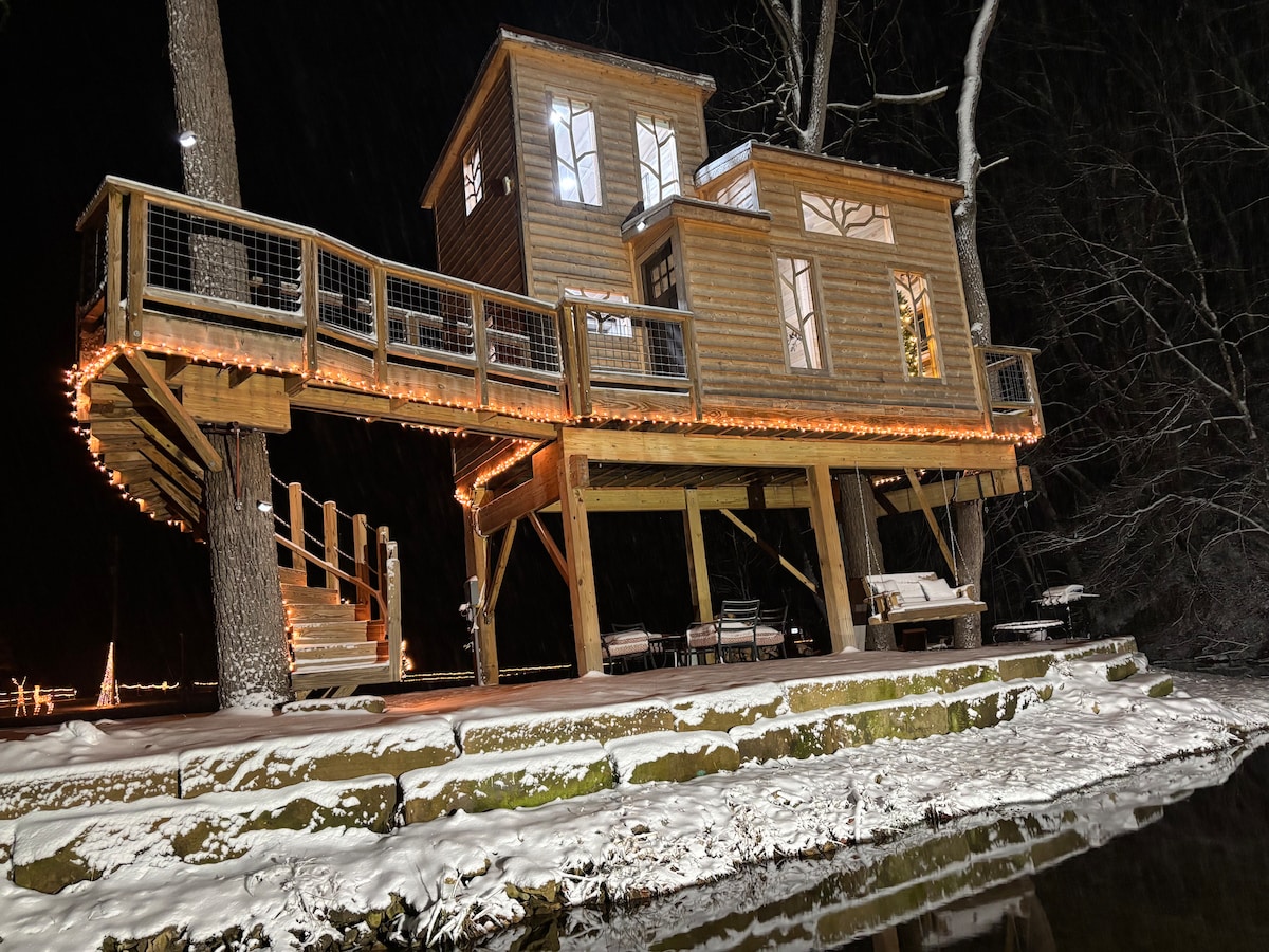 Reconnect and Rekindle This Holiday Season. Escape to The Royal Roost at Owl Hollow, where the magic of the holidays comes alive. Cozy up amongst the glimmering Christmas lights and sip hot cocoa in the comfort of your arboreal abode. The Royal Roost Treehouse at Owl Hollow offers a one-of-a-kind luxury escape. Combining rustic charm with refined comfort. Whether you’re seeking a peaceful getaway or a romantic retreat, the Royal Roost invites you to relax and reconnect.