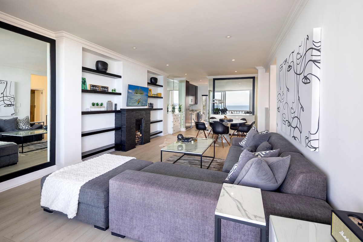 Genieße atemberaubende Sonnenuntergänge und einen fantastischen Meerblick von jedem Zimmer aus. Blick auf das Meer, Tafelberg, Robben Island, den Strand und einen Golfplatz. Unser Apartment zur Selbstverpflegung mit 2 Schlafzimmern liegt nur wenige Gehminuten vom Strand entfernt und in der Nähe des Stadtzentrums (8 km entfernt). 124m ² Modernes Apartment mit einem privaten Waschbereich. Genieße den spektakulären Blick auf Tafelberg, Signal Hill, Lion's Head, Robben Island und die Lagune. Schnelles Glasfaser-Internet, Netflix und Apple TV! Notstromversorgung in der Wohnung & für Aufzug!