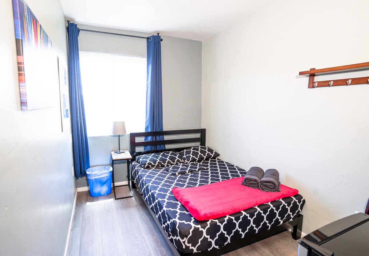Economy Private Room with shared bath at Lucky D’s Hostel – prime Downtown San Diego location! Stay in the heart of downtown San Diego at Lucky D’s Hostel! Our private room with a shared bathroom offers comfort, convenience, and unbeatable value. Step outside and you’ll find yourself surrounded by vibrant bars, eclectic shops, and delicious restaurants. We’re just 3 blocks from Petco Park and only a 10-minute walk to the Convention Center — perfect for catching a game or attending an event.