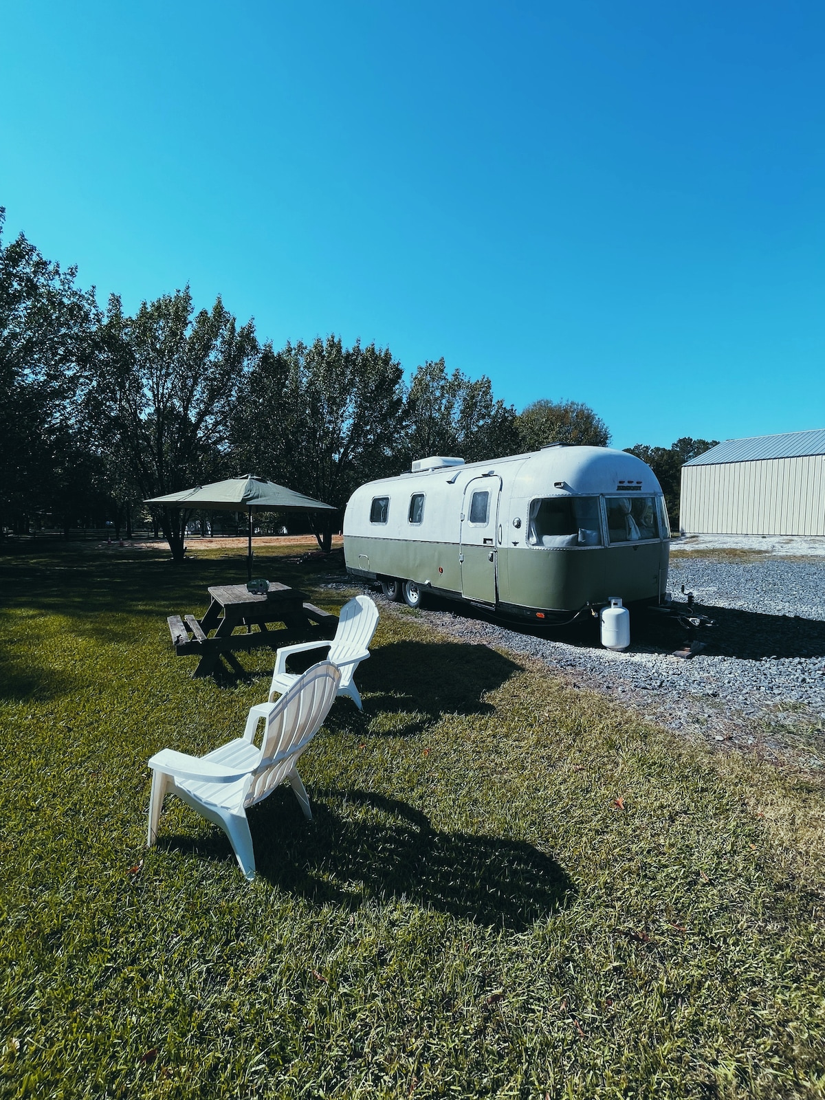 Dieser Vintage-Airstream wurde komplett renoviert, um ihn wieder zu seinem früheren Glanz zu bringen! Es gibt ein großes Bett und einen Memory-Schaum-Futon für 4 Personen. Wir haben ein Gaskochfeld, eine Kombination aus Mikrowelle und Heißluftfritteuse und einen Gasgrill im Freien, um perfekte Campingmahlzeiten zuzubereiten. Wir haben 2 Fernseher drinnen und 1 draußen. Es gibt ein tolles Soundsystem, um deine Lieblingsmusik zu hören. Das Beste an diesem Glamping-Erlebnis ist der schöne Badebereich im Freien, der sich perfekt zum Entspannen eignet!